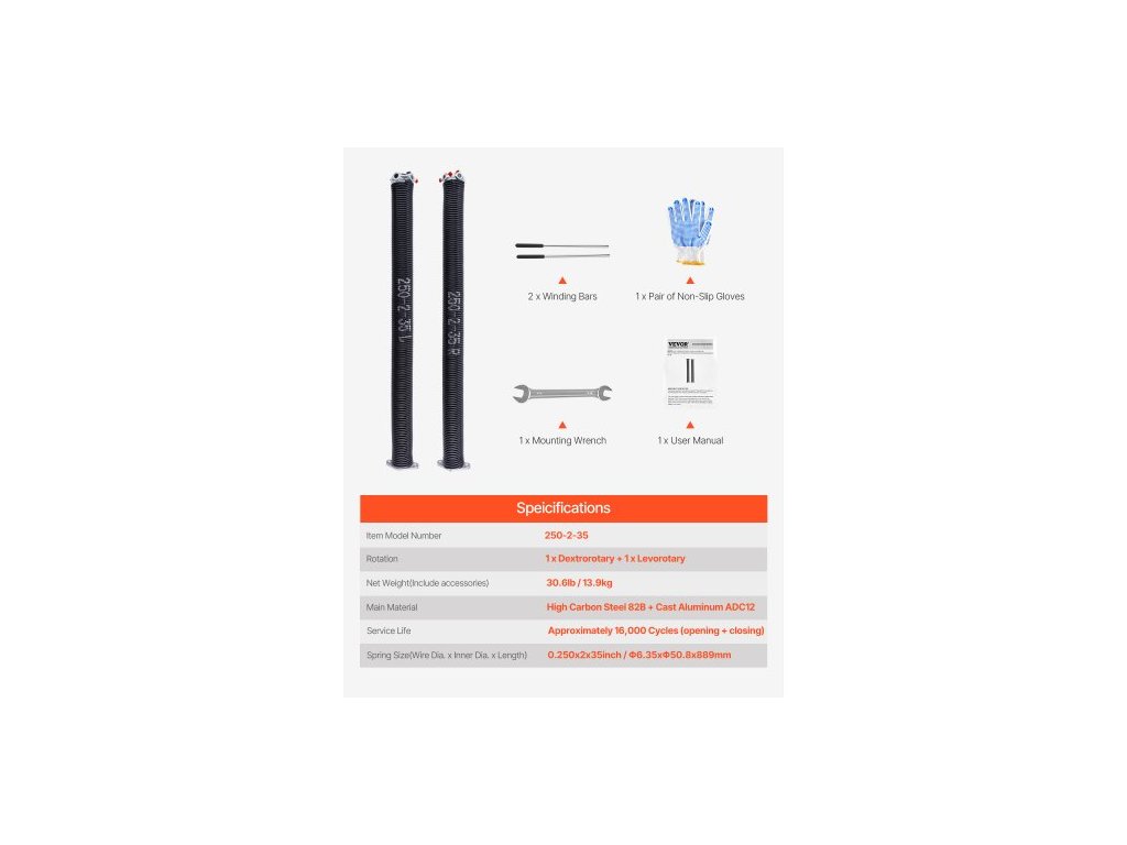 Životnost: Přibližně 16 000 cyklů (otevírání + zavírání), Čistá hmotnost (včetně příslušenství): 30,6 lb / 13,9 kg, Velikost pružiny (průměr drátu x vnitřní průměr x délka): 0,250 x 2 x 35 palců / Φ6,35 x Φ50,8 x 889 mm, Číslo modelu položky: 250-2-35, Rotace: 1 x pravotočivá + 1 x levotočivý, hlavní materiál: vysoce uhlíková ocel 82B + litý hliník ADC12