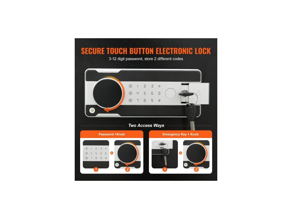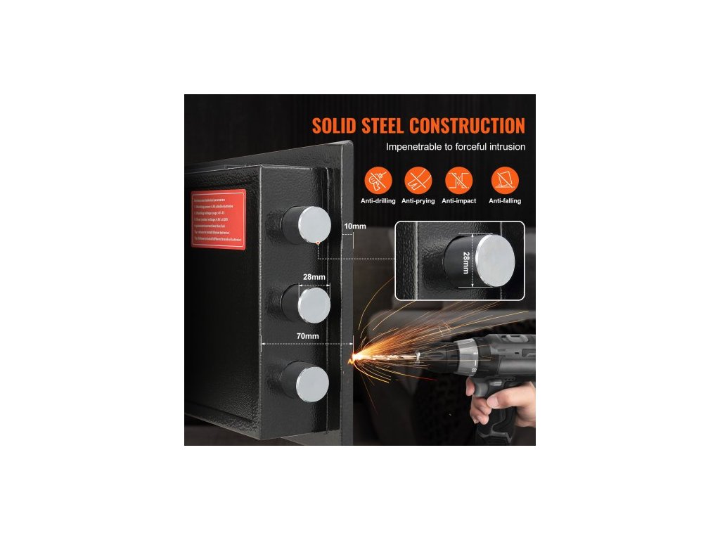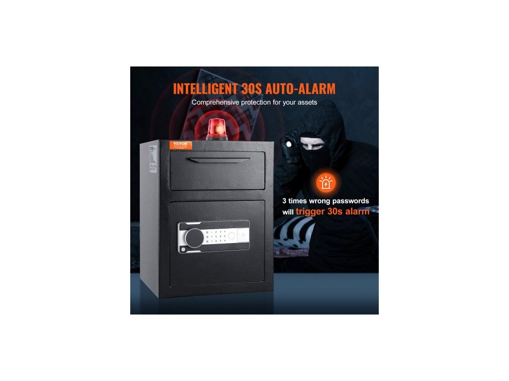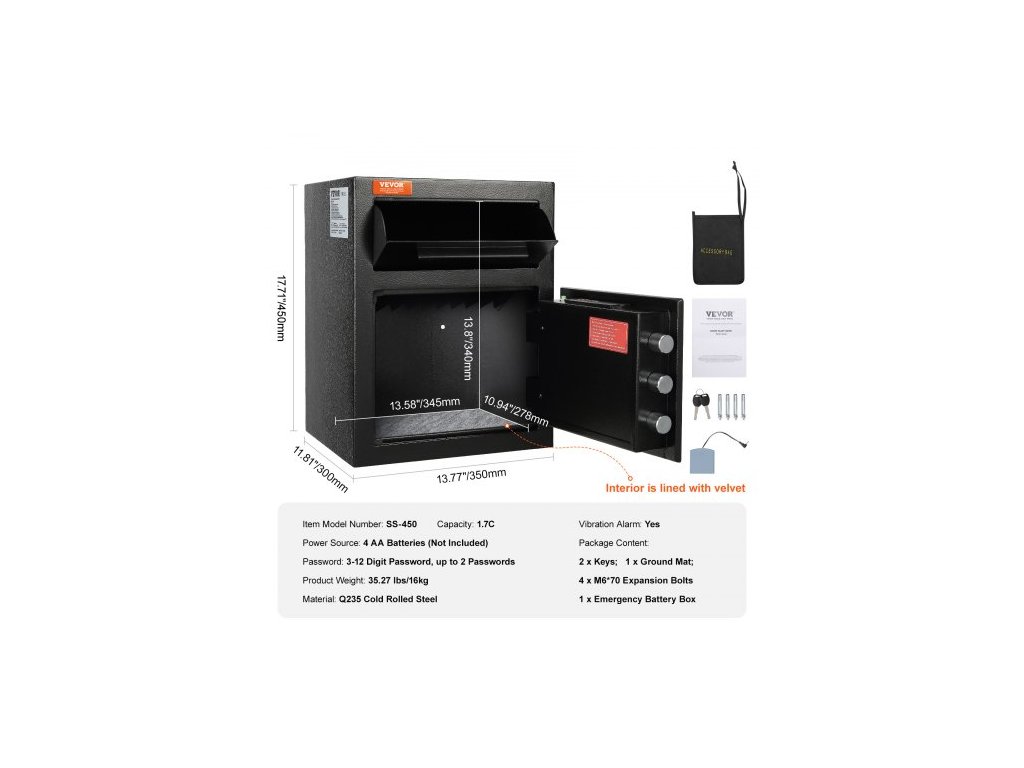 Vnitřní rozměry: 13,58x10,94x13,38 palce/345x278x340 mm,Vibrační alarm: Ano,Kapacita: 1,7C,Napájení: 4 baterie AA (nejsou součástí dodávky),Číslo modelu položky: SS-450,Hmotnost výrobku: 35,27 lbs/16 kg,Rozměry výrobku (DxŠxV): 13,77x11,81x17,71 palce/350x300x450 mm, Materiál: Za studena válcovaná ocel Q235, Heslo: 3–12místné heslo, až 2 hesla