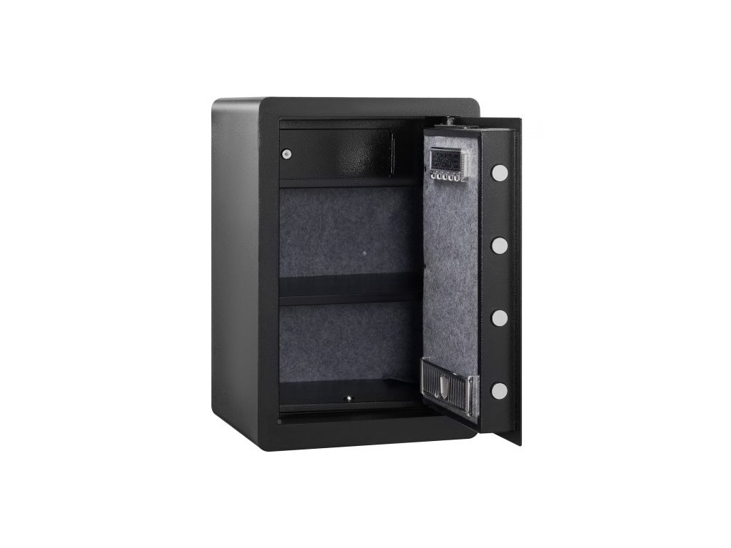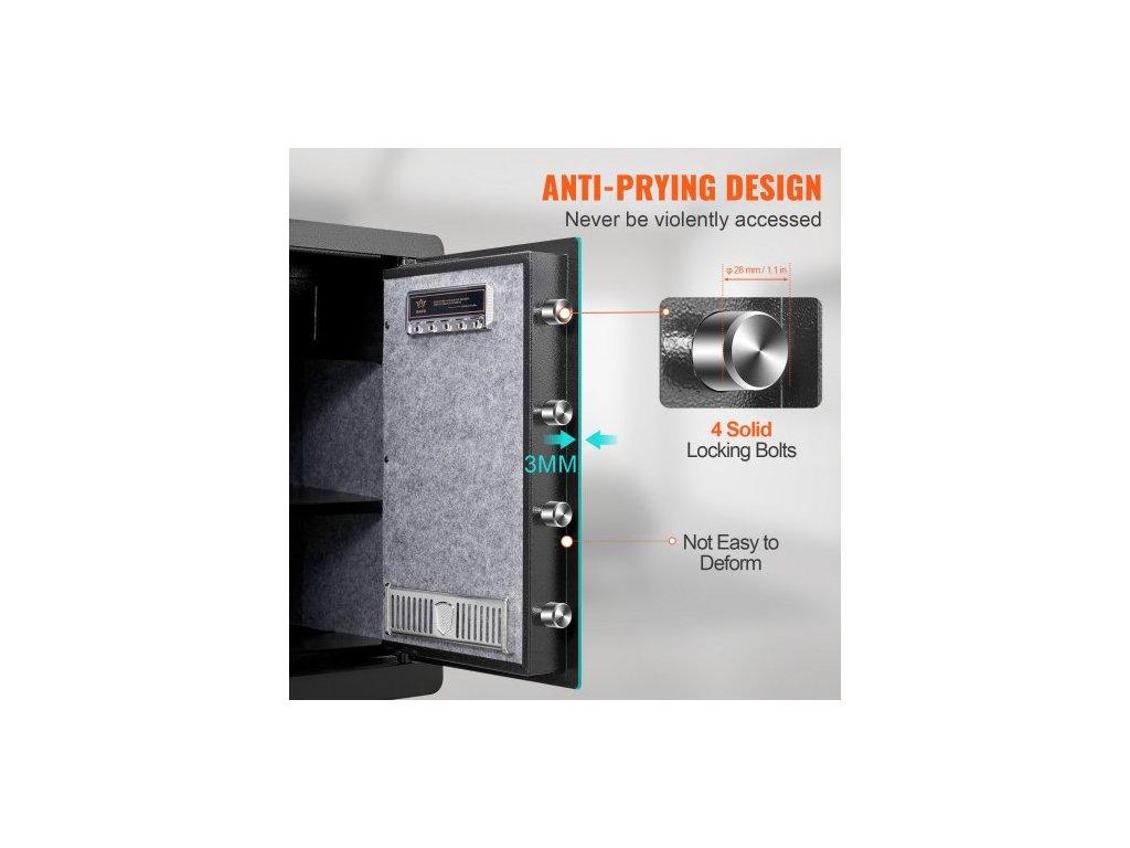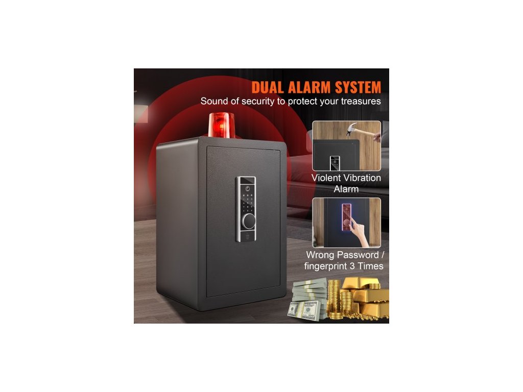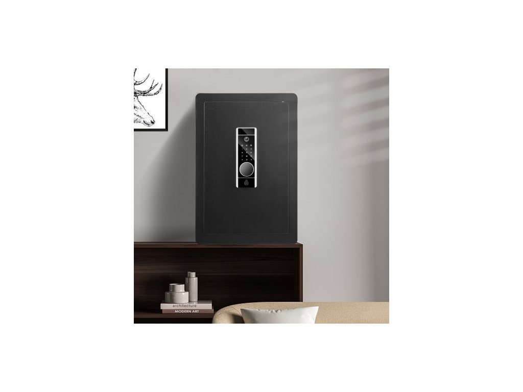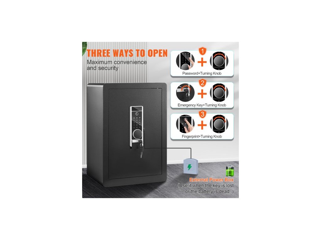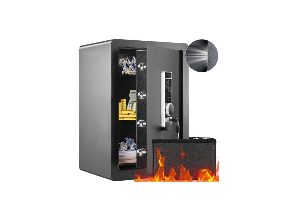 Počet zamykacích šroubů: 4,Objem: 2,2 krychlových stop,Způsoby otevírání: Heslo, klíč a otisk prstu,Hmotnost trezoru: 50,4 lbs/22,85 kg,Rozměry police: 15,35x12,60 palce/390x320 mm,Materiál: Za studena válcovaná uhlíková ocel,Vnější rozměry: 15,75x12,99x23,62 palce/400x330x600 mm,Dveře Tloušťka: 3 mm, Průměr pojistných šroubů: 28 mm, Vnitřní rozměry: 397 x 260 x 597 mm