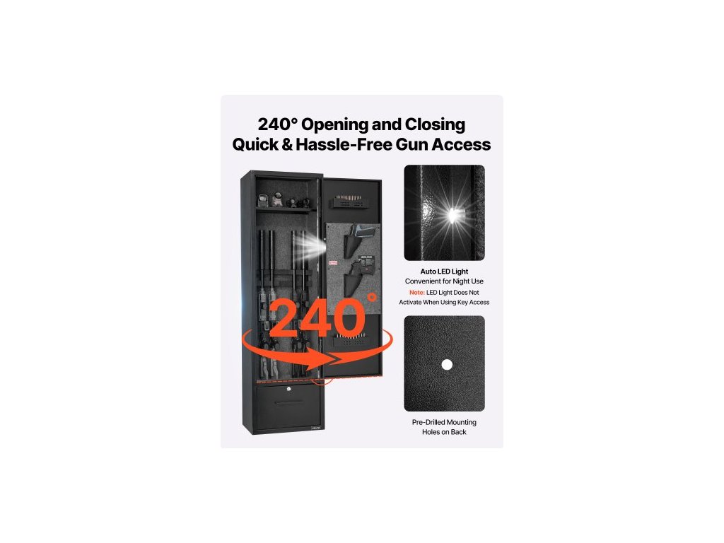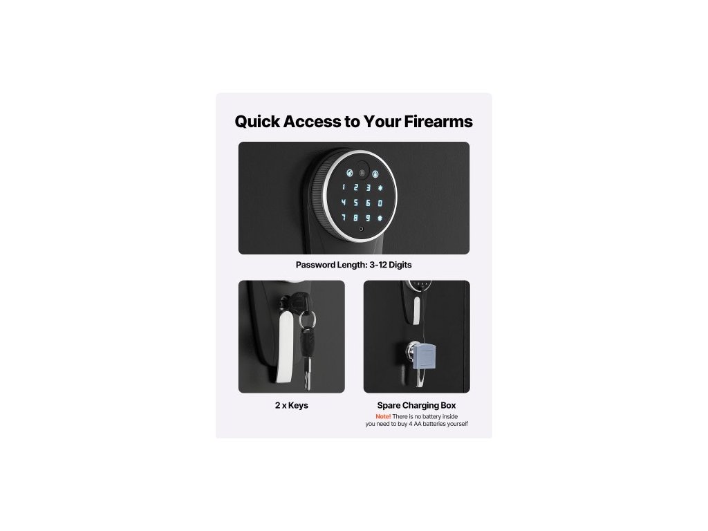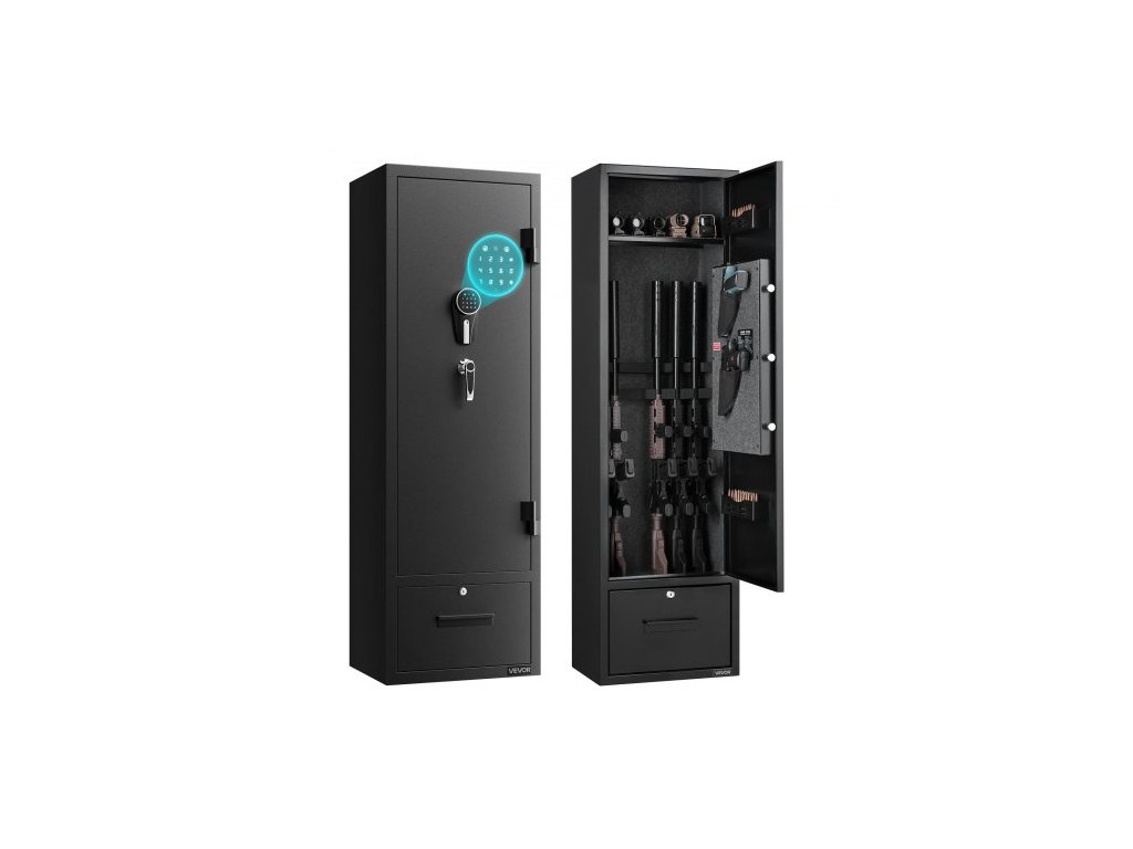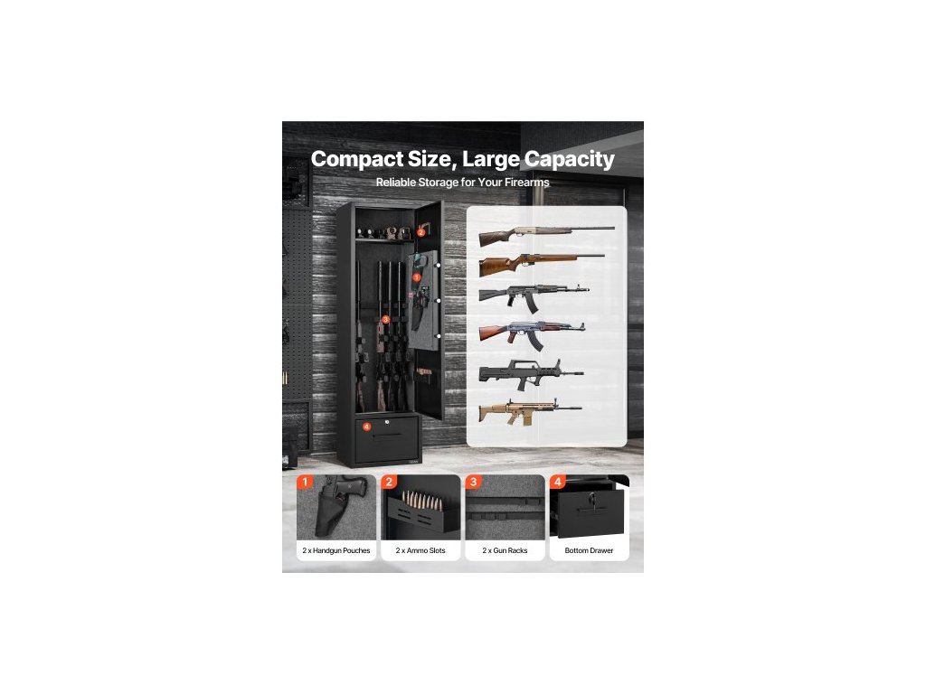 Trezor na zbraně 4, skříň na dlouhé zbraně pro pušky a pistole, rychlý přístup k trezoru na zbraně se 2 sloty na munici, 2 kapsy na pistole a 2 nastavitelnými přihrádkami, velká digitální skříň se zámkem na klíč a hesloVelká kapacita