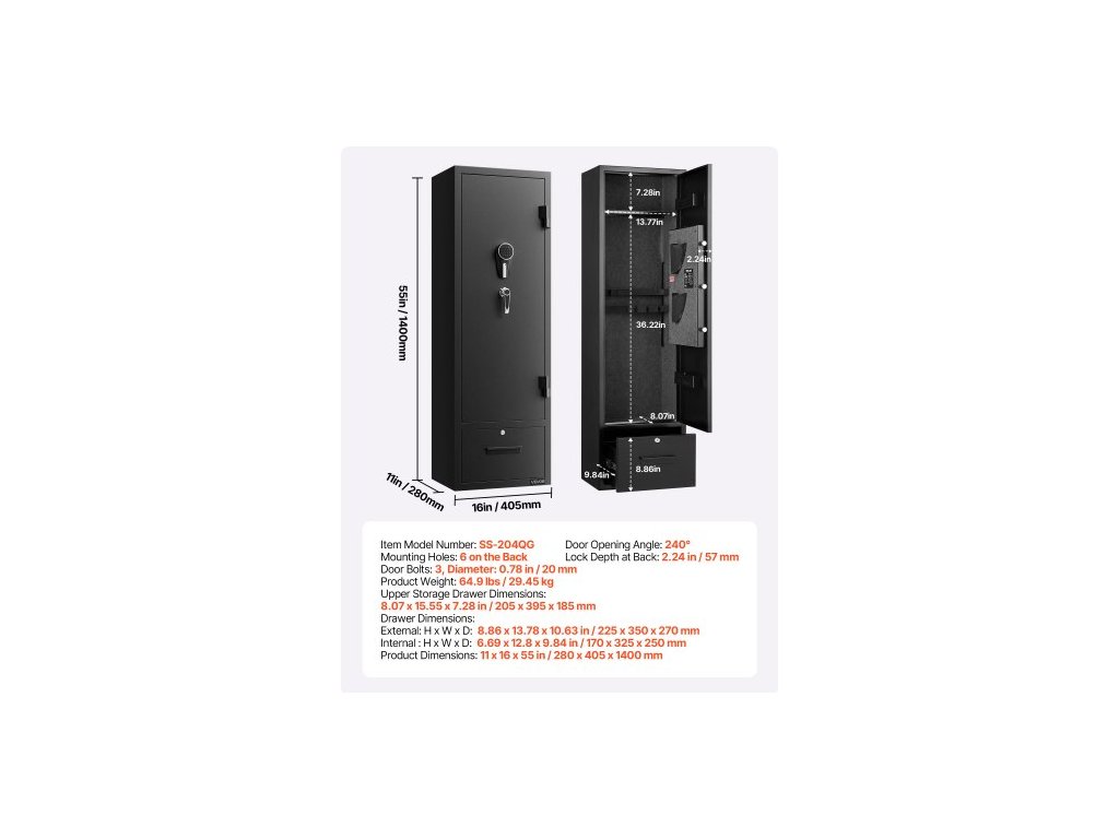 Montážní otvory: 6 na zadní straně, Zamykací šrouby: 3, Průměr 20 mm, Úhel otevření dvířek: 240°, Hloubka zámku dvířek: 57 mm, Číslo modelu položky: SS-204QG, Hmotnost výrobku: 29,45 kg, Rozměry horní úložné zásuvky: 270 x 350 x 185 mm, Rozměry výrobku: 11 x 16 x 55 palců / 280 x 405 x 1400 mm