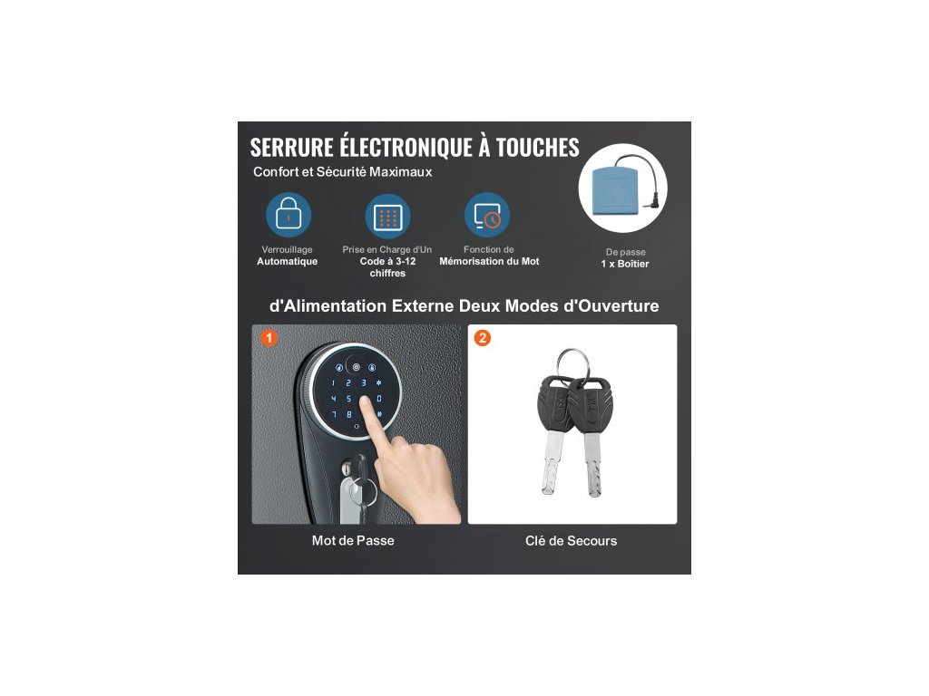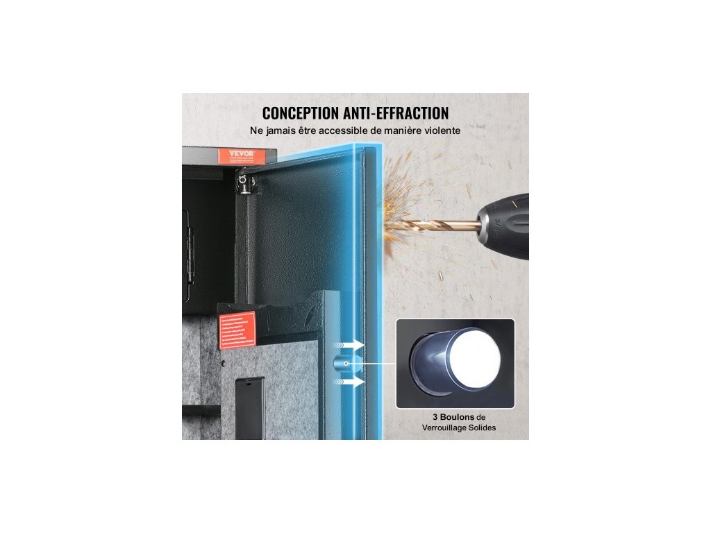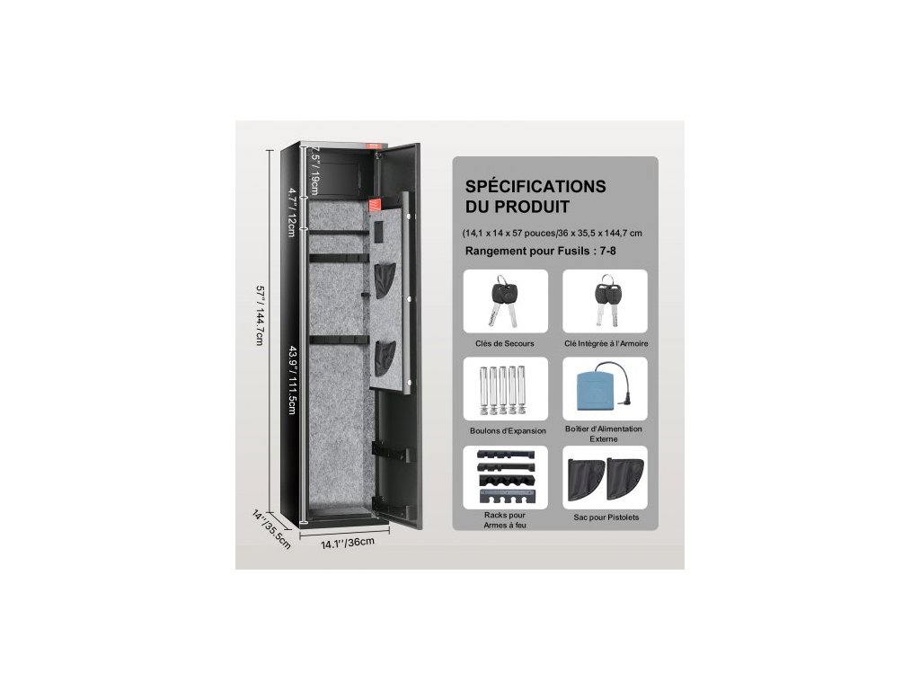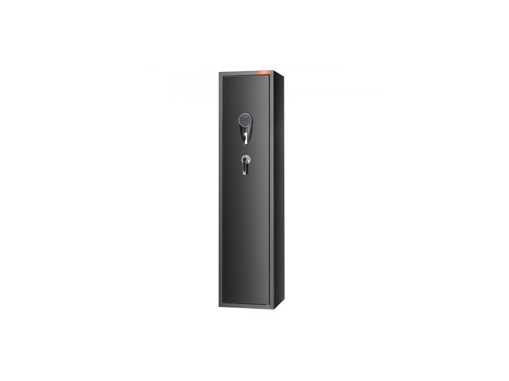 Montážní otvor: dole: 4; zadní strana: 6, úložný box na náboje: 9,4''x2,4''/240x60 mm, šrouby: 3, materiál: ocelový plech válcovaný za studena Q235, tloušťka dveřního plechu: 0,07''/1,8 mm, odnímatelný stojan na pistole: 13,8''x1,3''/350x30 mm, nastavitelný, kód: 3-12 číslic, provozní napájení: 4 ks baterií AA, tloušťka stěny skříně: 0,04"/1,1 mm, rozměry výrobku: 13,8''x11,8''x57''/350x300x1447 mm, úložná kapacita: 5, Automatický zámek: ANO