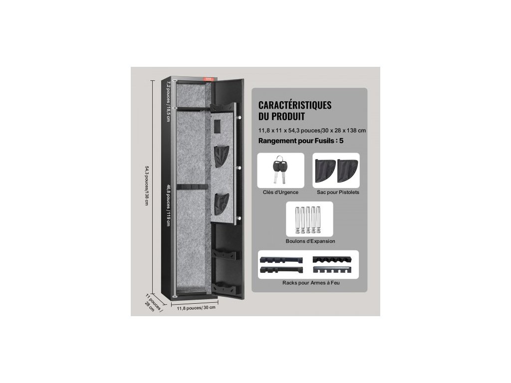 Montážní otvor: dole: 4; zadní strana: 6, úložný box na náboje: 7,5''x2,4''/190x60mm, šrouby: 3, materiál: ocelový plech válcovaný za studena Q235, tloušťka dveřního plechu: 0,07''/1,8 mm, stojan na pistole: 11,8''x1,2''/300x30 mm, odnímatelný, stojan na pistole: 11,8''x1,2''/300x30 mm, nastavitelný, kód: 3-12 číslic, provozní napájení: 4 ks baterií AA, tloušťka stěny skříně: 0,04"/1,1 mm, rozměry výrobku: 11,8''x11''x54,3''/300x280x1380 mm, úložná kapacita: 5, Automatický zámek: ANO