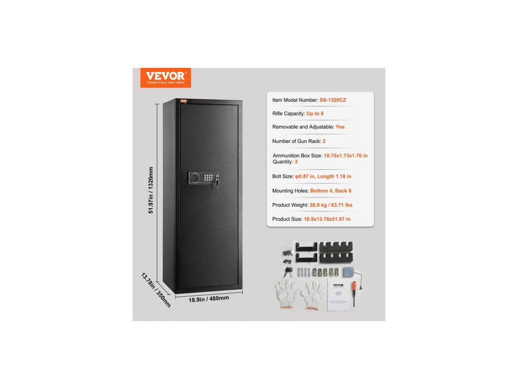 Kapacita pušky: Až 8,Rozměry boxu na náboje: 273x44x44,7 mm/10,75x1,73x1,76 palce, Množství: 3,Číslo modelu položky: SS-1320CZ,Velikost závěru: φ 22 mm/0,87 palce,Délka 30 mm/1,18 palce,Hmotnost výrobku: 28,9 kg/63,71 lbs,Odnímatelné a nastavitelné: Ano,Počet pažeb zbraní: 2,Rozměry výrobku: 480x350x1320 mm/18,9 x 13,78 x 51,97 palce