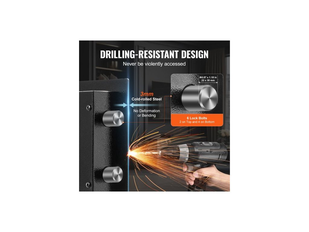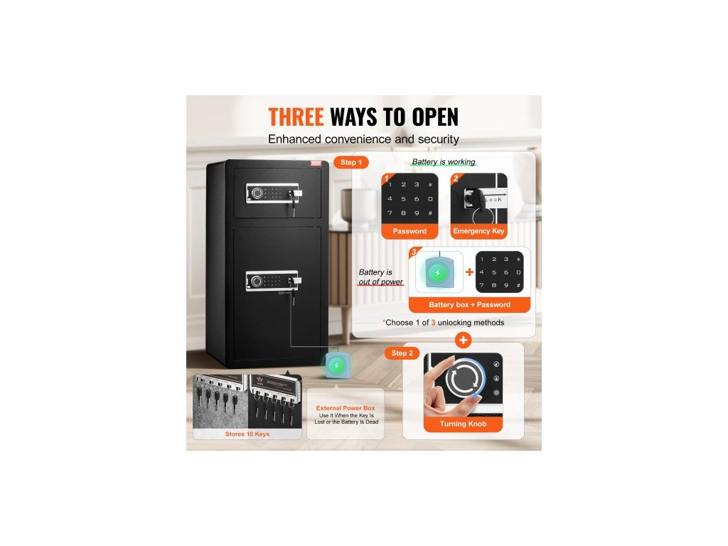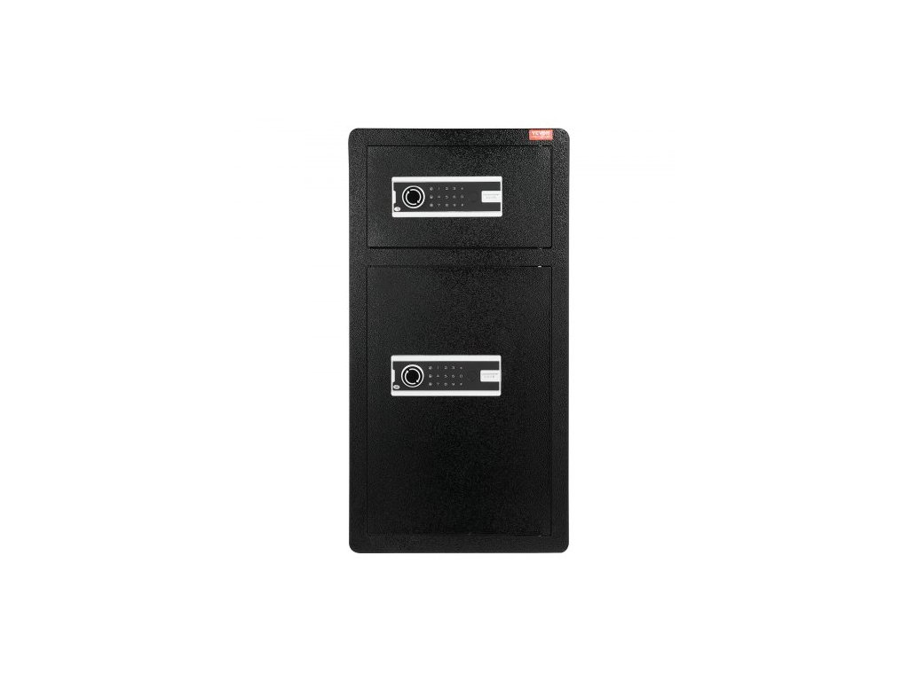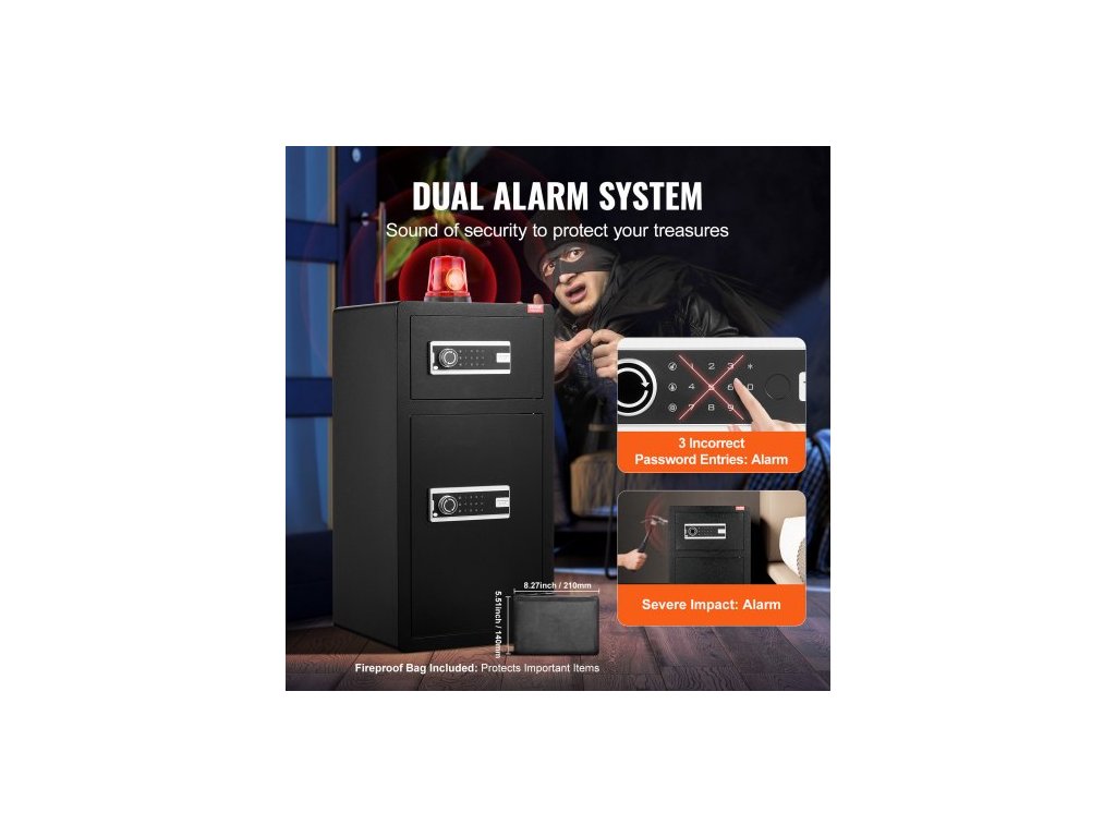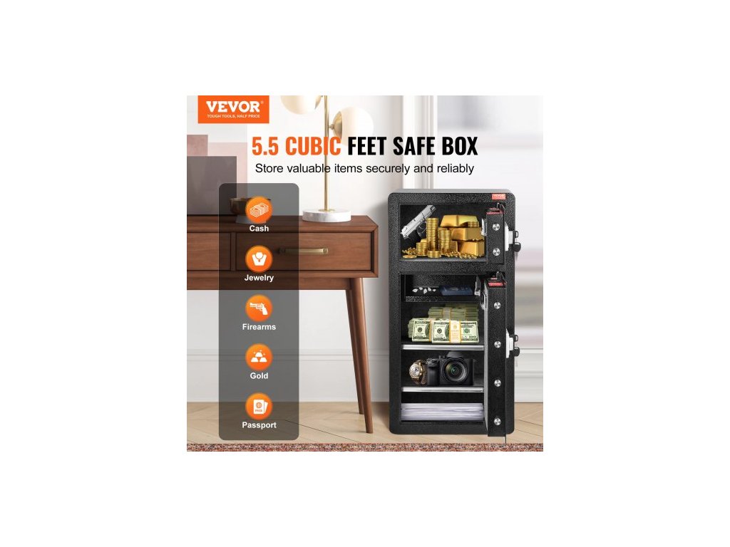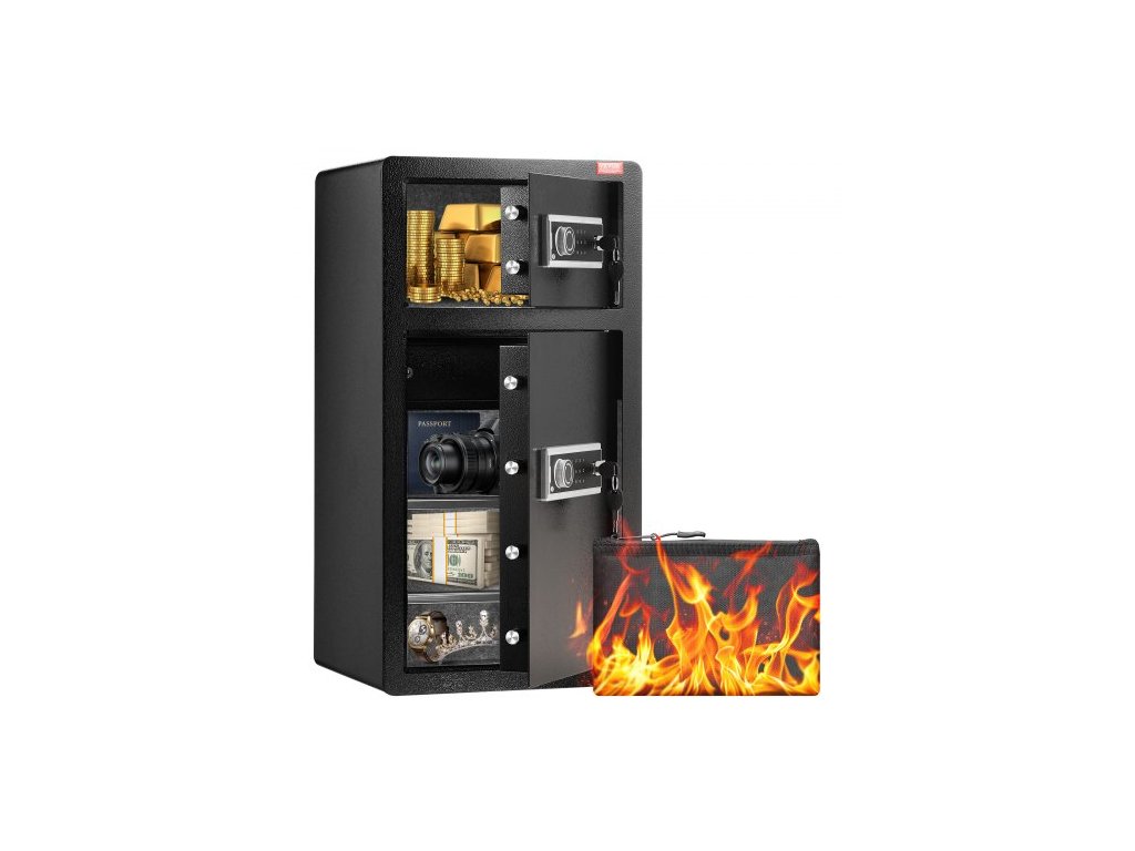 Trezor s dvojitými dveřmi o objemu 5,5 krychlových stop s klíčovým zámkem a heslem, uzamykatelný trezor s nehořlavou taškou, věšákem na klíče, LED osvětlením, 2 výškově nastavitelnými a odnímatelnými dělicími příčkami a 1 přihrádkou na peníze,
