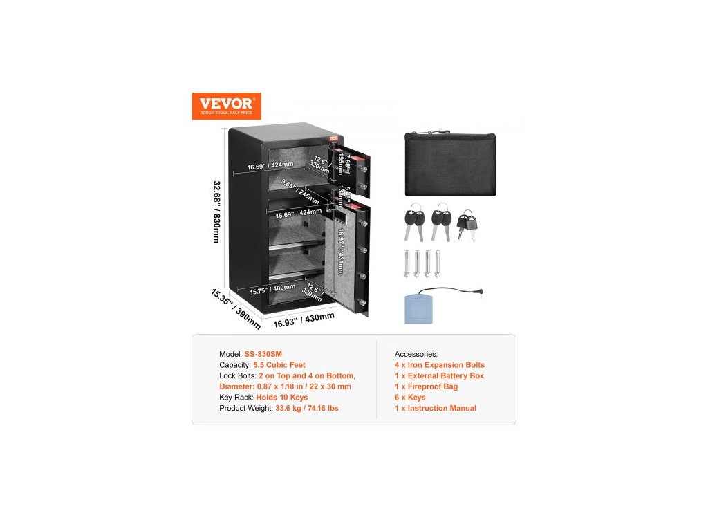 Zámkové závory: 2 nahoře a 4 dole, Průměr: 0,87 × 1,18 palce / 22 × 30 mm,Objem: 5,5 kubických stop,Model: SS-830SM,Hmotnost výrobku: 33,6 kg / 74,16 lbs,Věšák na klíče: Pojme 10 klíčů,195 x 345 x 345 mm / 7,68 x 13,58 x 13,58 palce:,Produkt Rozměry: 830 x 430 x 390 mm / 32,68 x 16,93 x 15,35 palce, Vnitřní rozměry: 575 x 345 x 375 mm / 22,64 x 13,58 x 14,76 palce