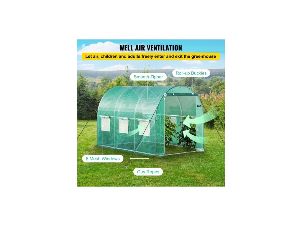 Průchozí tunelový skleník, přenosný skleník na rostliny 304,8 x 213,4 x 213,4 cm s pozinkovanými ocelovými obručemi, 1 horním nosníkem, diagonálními tyčemi, dveřmi na zip a 6 rolovacími okny, zelenýVelký prostor