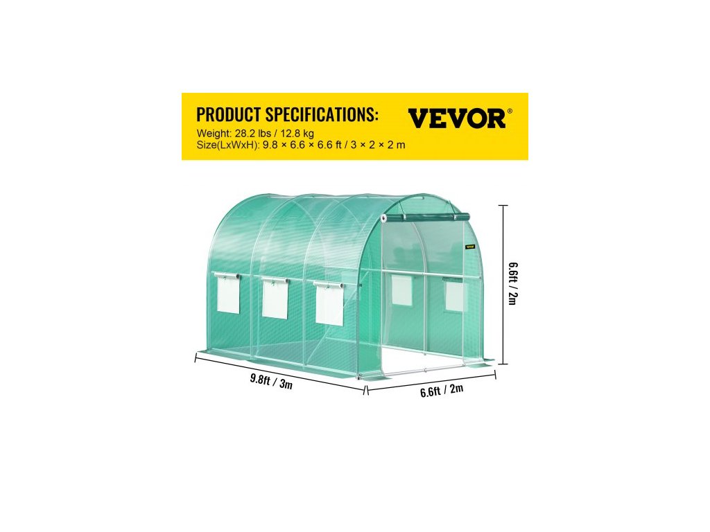 Síťovaná okna: 6, Diagonální tyče: 2,Rozměry: 9,8 x 6,6 x 6,6 stop / 3 x 2 x 2 m,Barva: Zelená,Model: VV-TG-1077GREEN,Materiál krytu: 140 g/cm³ PE,Materiál rámu: Pozinkovaná ocel,Horní nosník: 1,Hmotnost: 28,2 lbs / 12,8 kg