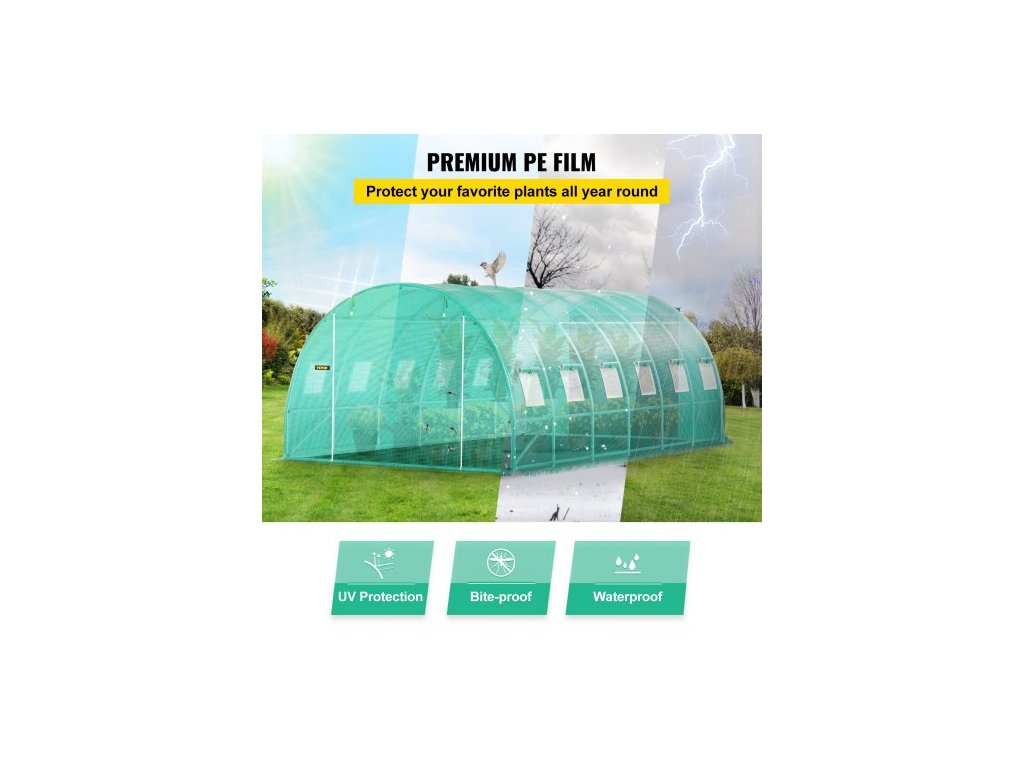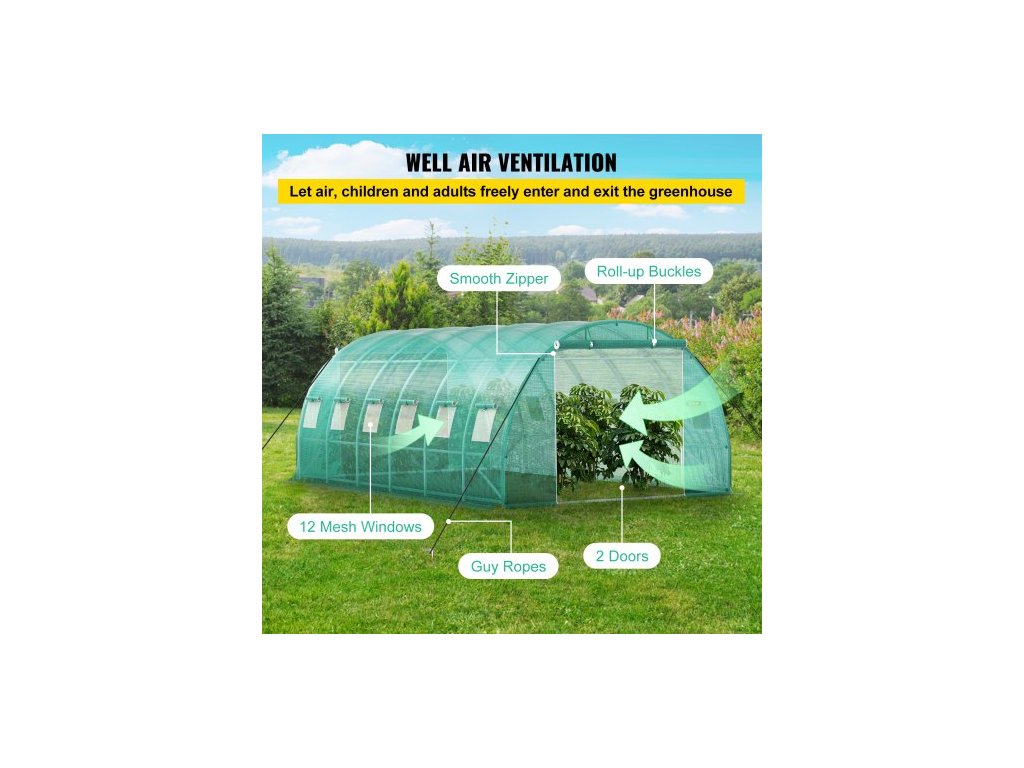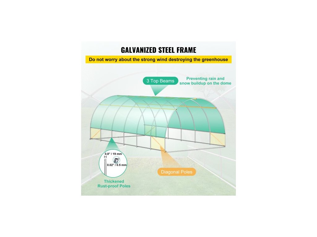 Průchozí tunelový skleník, přenosný skleník na rostliny 609,6 x 304,8 x 213,4 cm s pozinkovanými ocelovými obručemi, 3 horními nosníky, 4 diagonálními tyčemi, 2 dveřmi na zip a 12 rolovacími okny, zelenýVelký prostor