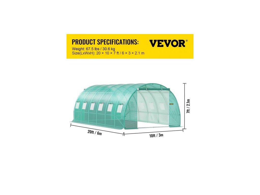 Síťovaná okna: 12, Horní nosníky: 3, Diagonální tyče: 4,Rozměry: 20 x 10 x 7 stop / 6,1 x 3 x 2,1 m,Barva: Zelená,Model: VV-TG-12107GREEN,Materiál krytu: 140 g/cm³ PE,Materiál rámu: Pozinkovaná ocel,Hmotnost: 67,5 lbs / 30,6 kg