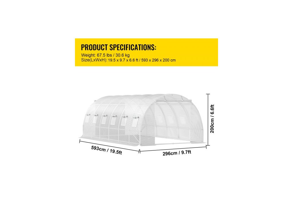 Síťovaná okna: 12, Horní nosníky: 3, Diagonální tyče: 4,Rozměry: 20 x 10 x 7 stop / 6,1 x 3 x 2,1 m,Barva: Bílá,Model: VV-TG-12107WHITE,Materiál krytu: 140 g/cm³ PE,Materiál rámu: Pozinkovaná ocel,Hmotnost: 67,5 lbs / 30,6 kg