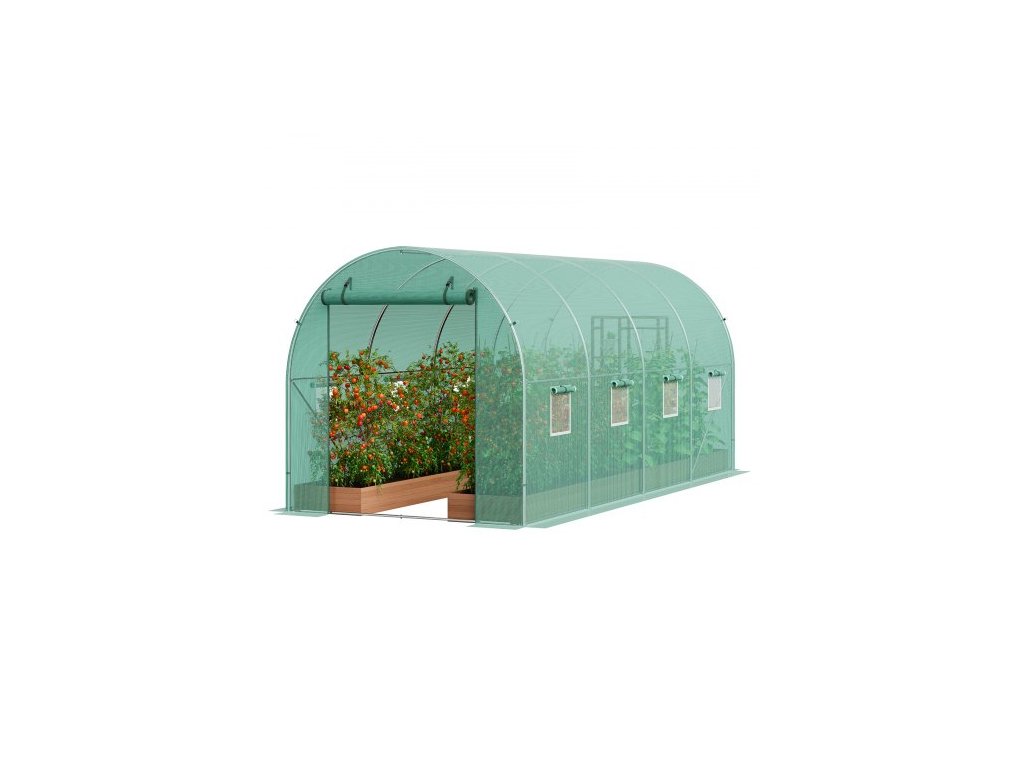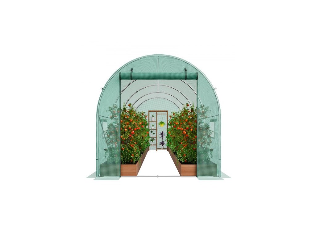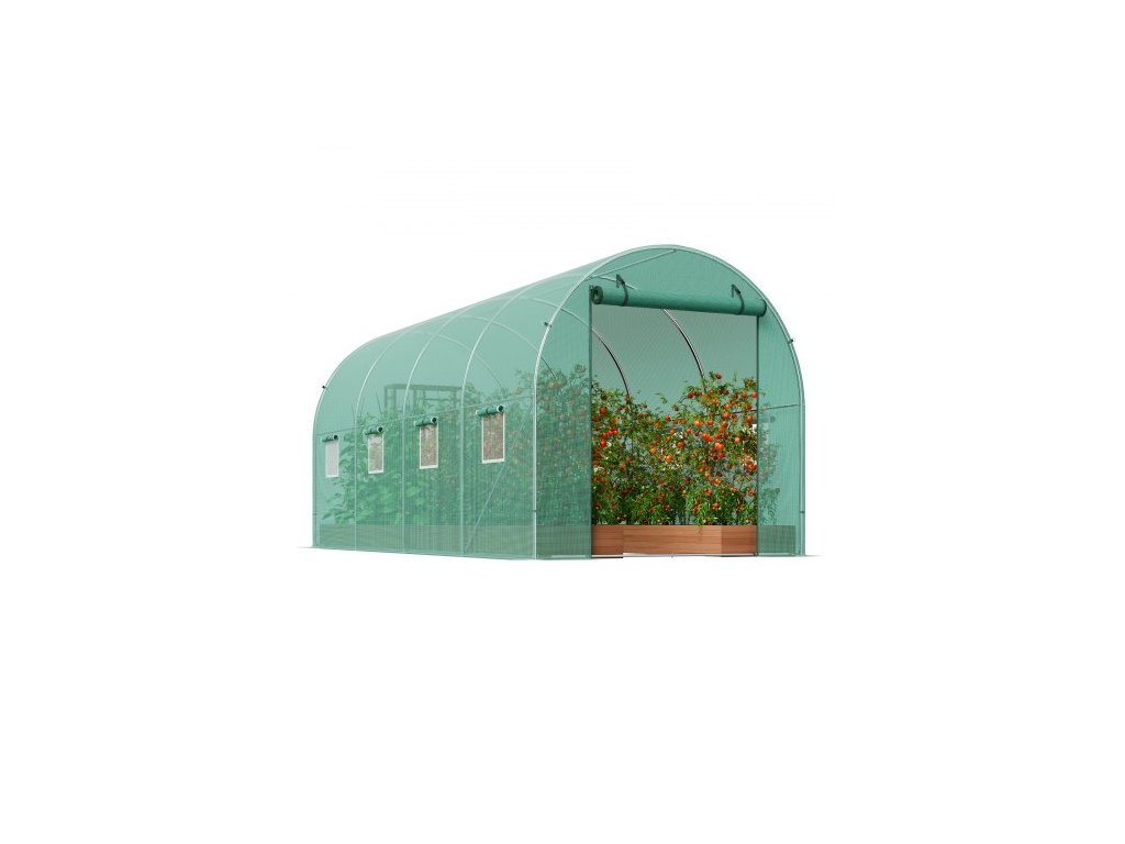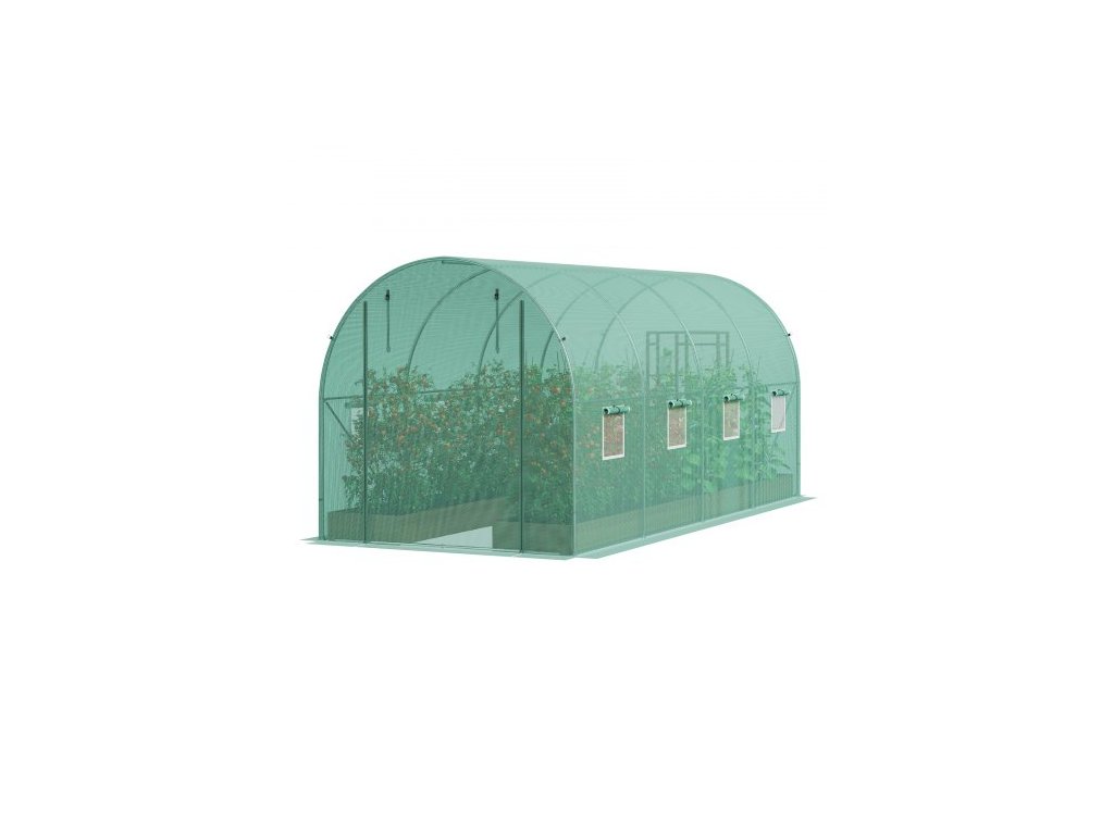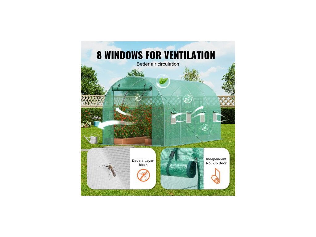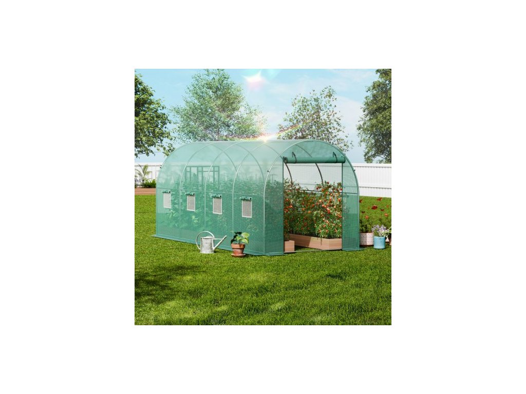 Tunelový skleník , 14,6x6,4x6,3 ft, kruhový skleníkový tunel, skleník na rostliny s pozinkovaným ocelovým rámem, zeleným PE krytem, rolovacími dveřmi na zip a 8 okny pro venkovní použití
