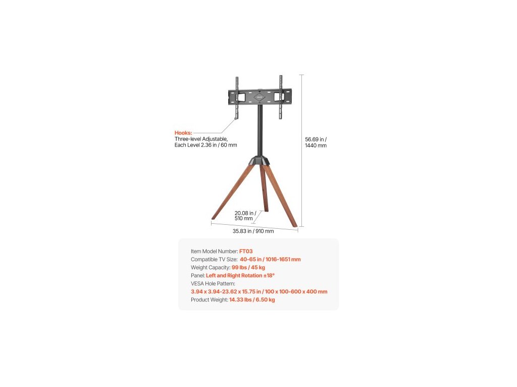 Panel: Otočení doleva a doprava ±18°, Nosnost: 45 kg, Číslo modelu položky: FT03, Hmotnost výrobku: 6,50 kg, Háky: Třístupňové nastavení, každá úroveň 60 mm, Kompatibilní velikost televizoru: 1016-1651 mm, Rozteč otvorů VESA: 3,94 x 3,94–23,62 x 15,75 palce / 100 x 100–600 x 400 mm, Rozměry produktu: 35,83 x 20,08 x 56,69 palce / 910 x 510 x 1440 mm