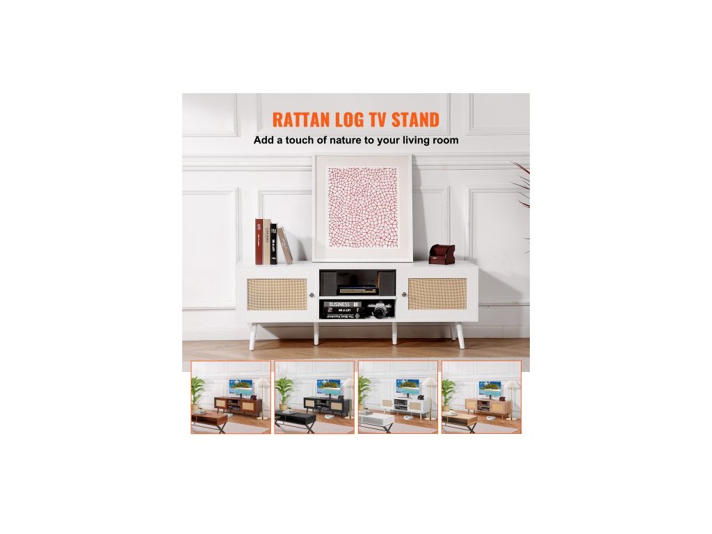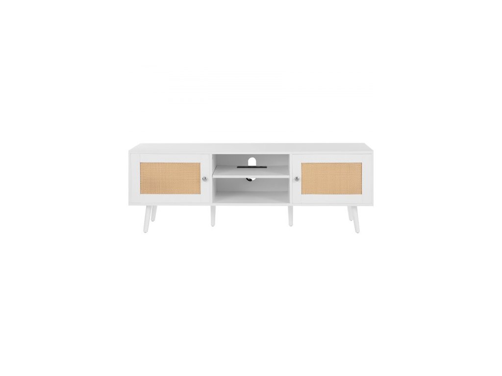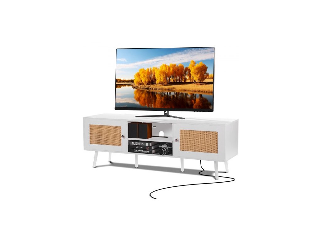 TV stolek z ratanu pro 65palcovou televizi, TV stolek v boho stylu s ratanovými dvířky, zábavní centrum s vestavěnou zásuvkou a USB porty, moderní televizní konzole do obývacího pokoje, mediální místnost, bíláPřirozené teplo