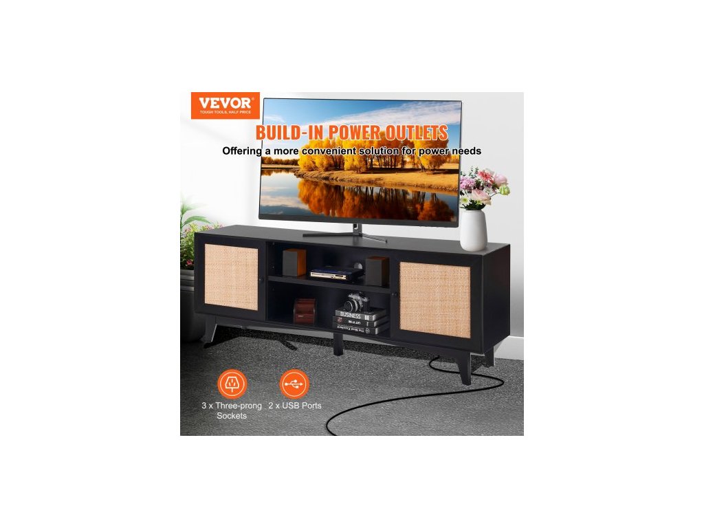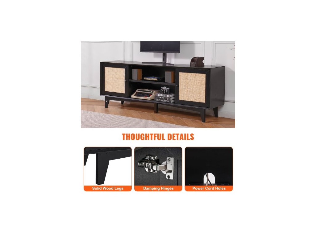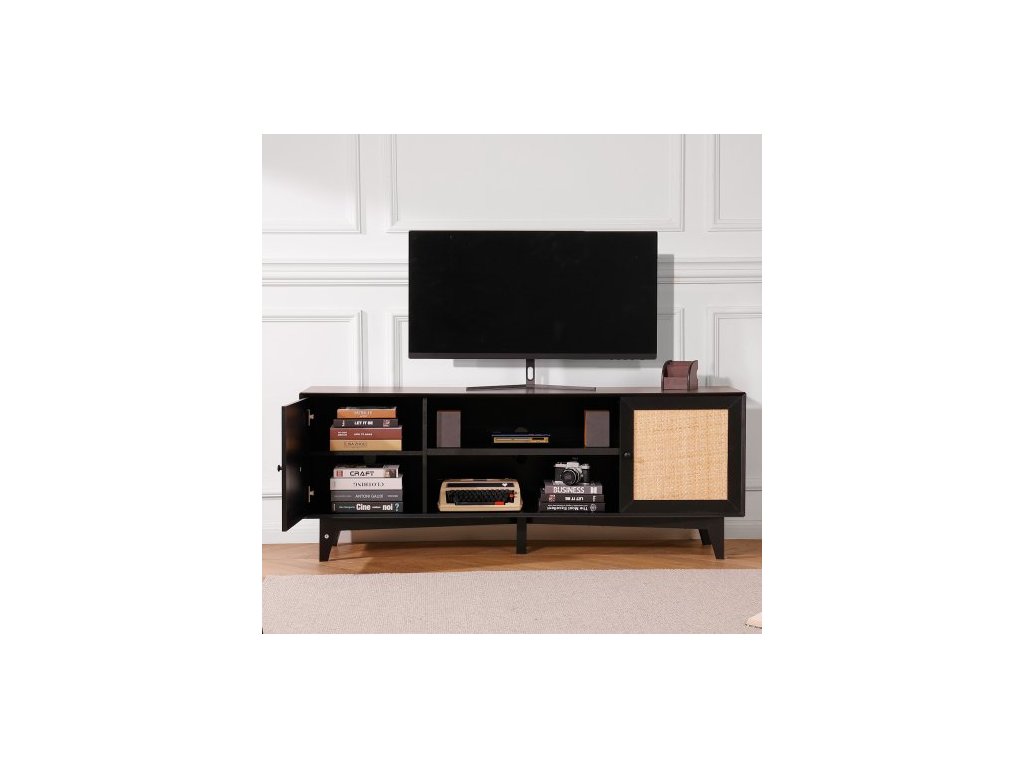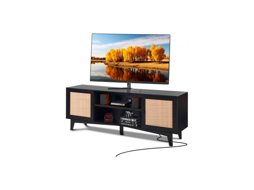TV stolek z ratanu pro 75palcovou televizi, boho TV stolek s ratanovými dvířky, zábavní centrum s vestavěnou zásuvkou, úložná skříňka se 2 policemi, moderní TV konzole do obývacího pokoje, mediální místnost, černá