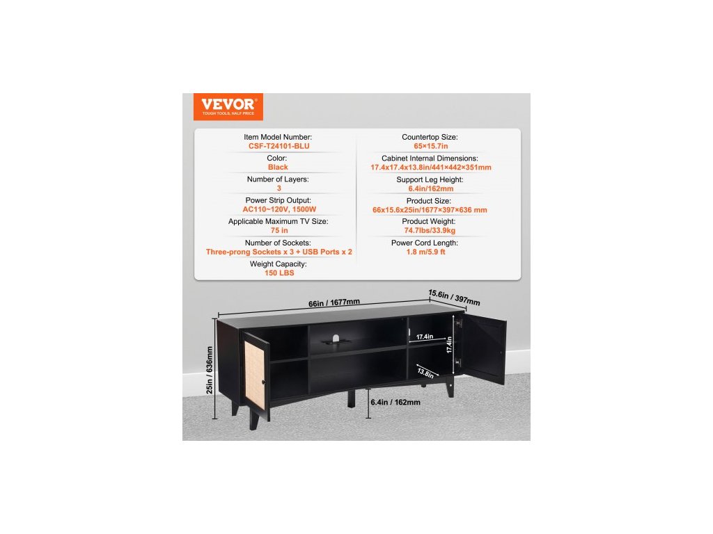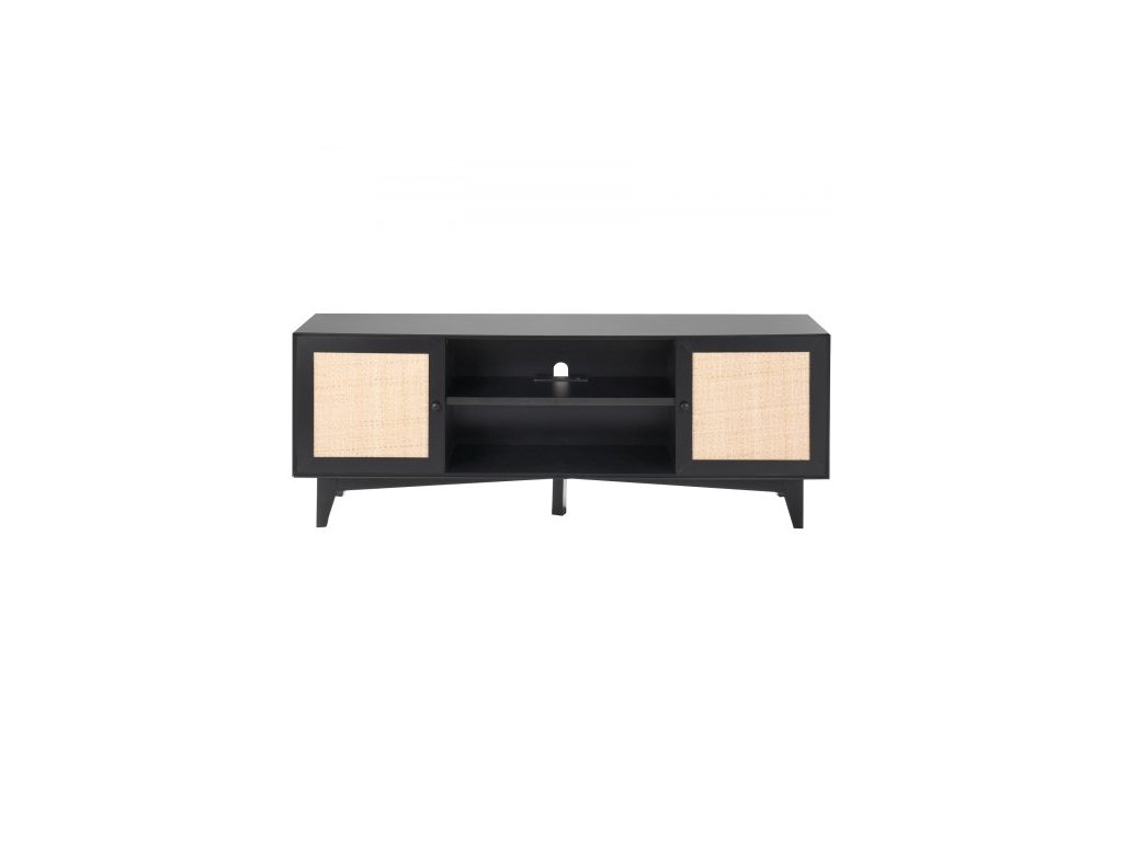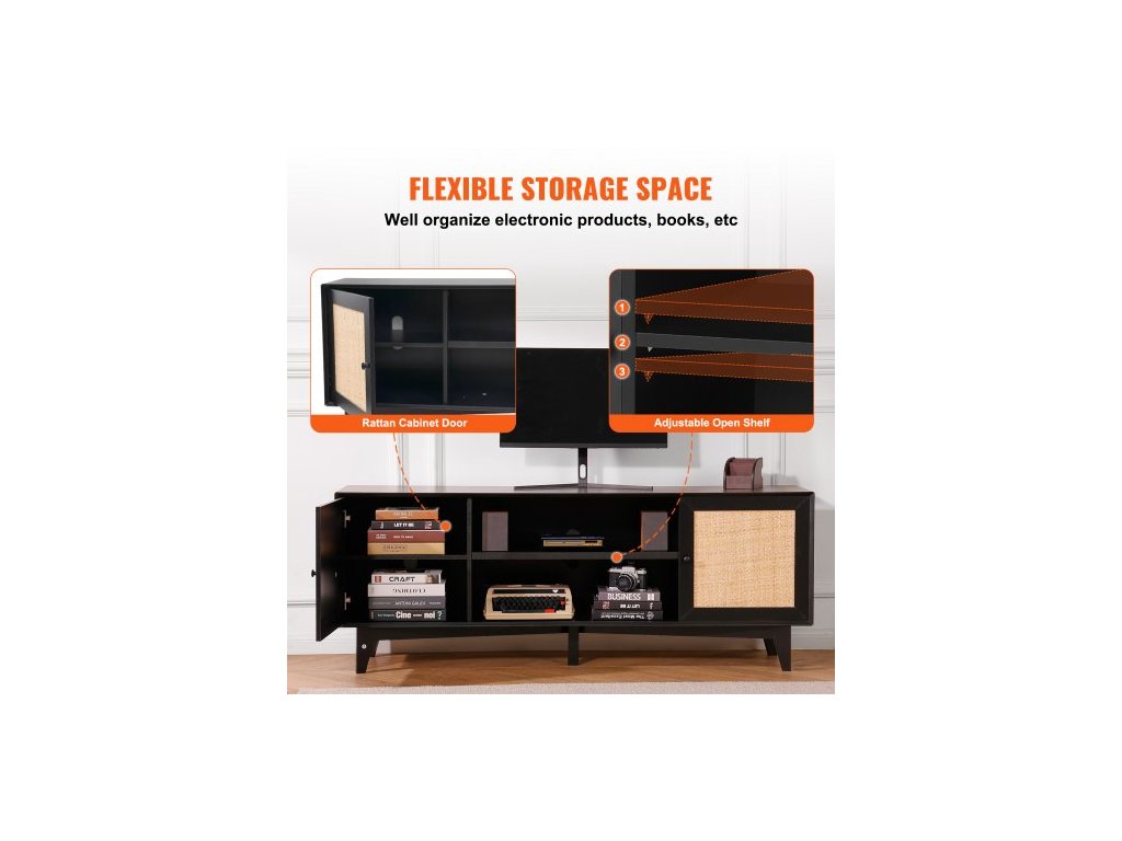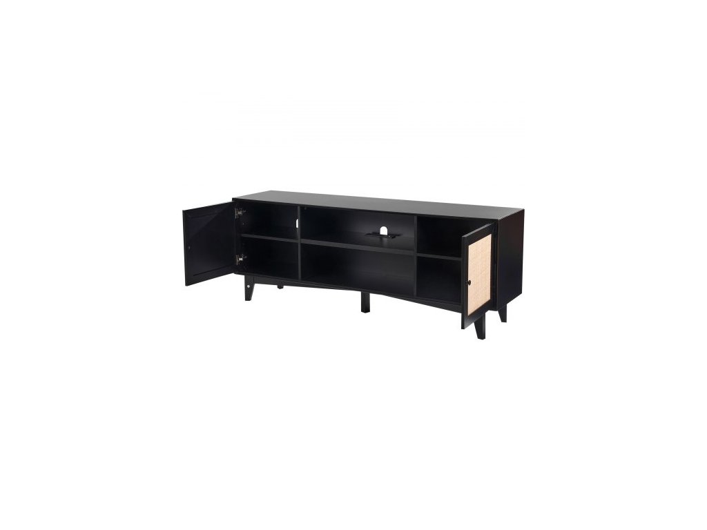 TV stolek z ratanu pro 75palcovou televizi, boho TV stolek s ratanovými dvířky, zábavní centrum s vestavěnou zásuvkou, úložná skříňka se 2 policemi, moderní TV konzole do obývacího pokoje, mediální místnost, černá