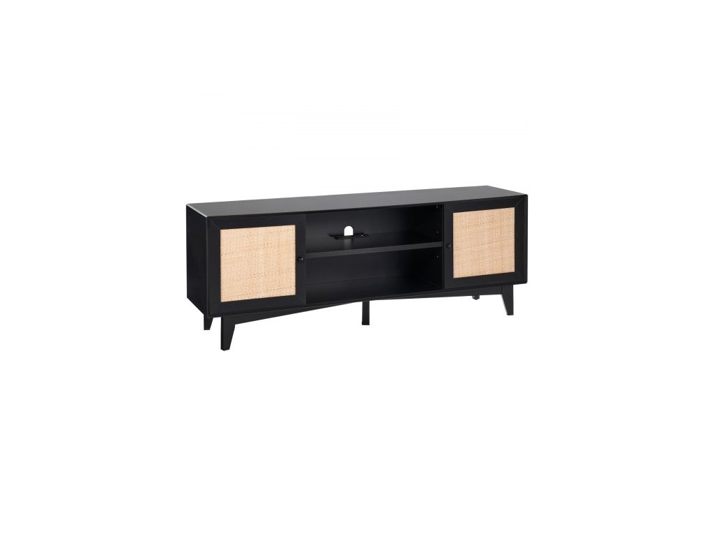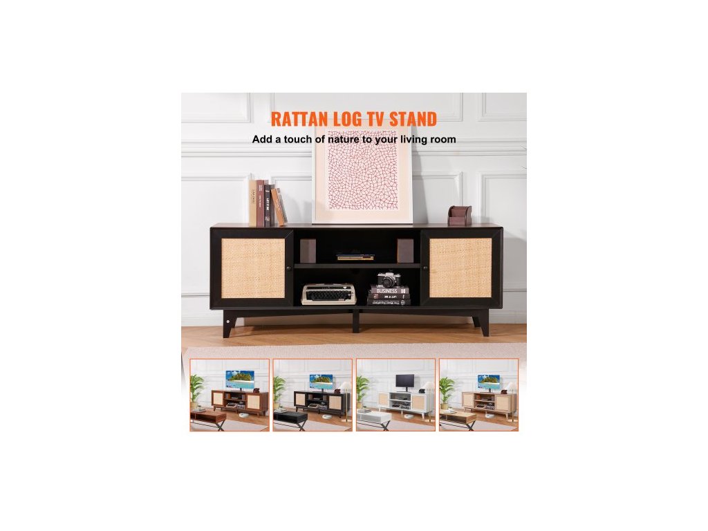 TV stolek z ratanu pro 75palcovou televizi, boho TV stolek s ratanovými dvířky, zábavní centrum s vestavěnou zásuvkou, úložná skříňka se 2 policemi, moderní TV konzole do obývacího pokoje, mediální místnost, černáPřirozené teplo