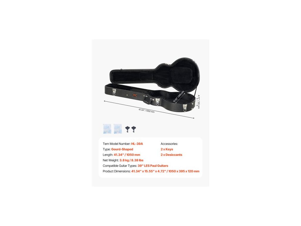 Typ: Tvar tykve,Kompatibilní typy kytar: 39" kytary LES Paul,Délka: 41,34" / 1050 mm,Číslo modelu položky: HL-39A,Rozměry produktu: 41,34" x 15,55" x 4,72" / 1050 x 395 x 120 mm,Čistá hmotnost: 8,38 lbs / 3,8 kg