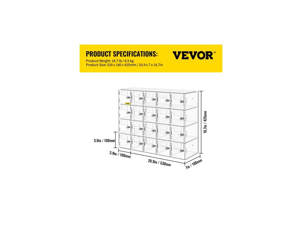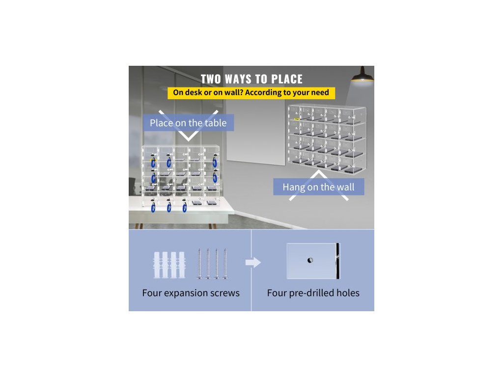 Způsob instalace: Šroubování, Velikost každého slotu: 3,9 x 7 x 3,9 palce/10 x 18 x 10 cm, Nosnost: 20 kg/44 lbs, Tvar: Obdélníkový, Hrubá hmotnost: 18,7 lb/8,5 kg, Materiál zámku: Nerezová ocel, Počet slotů: 20, Barva: Průhledná, Model: SJG-YKL-20M, Materiál: Akryl, Typ montáže: Nástěnná montáž, Volně stojící, Velikost výrobku: 20,9 x 7 x 16,7 53 x 18 x 42,5 cm