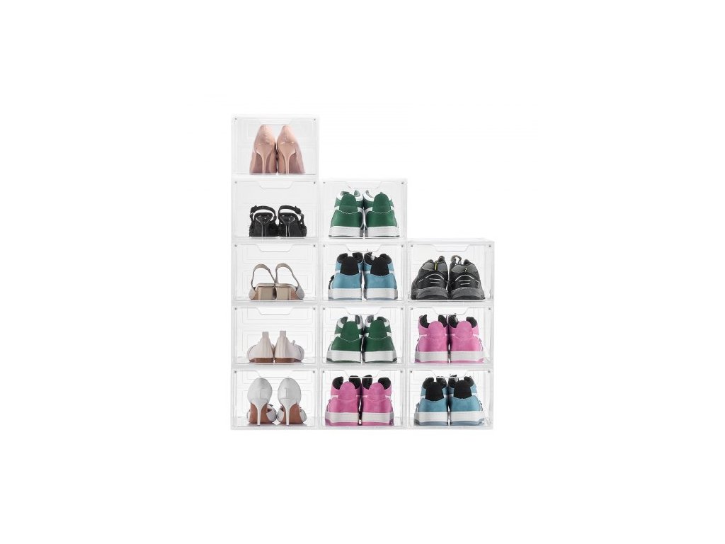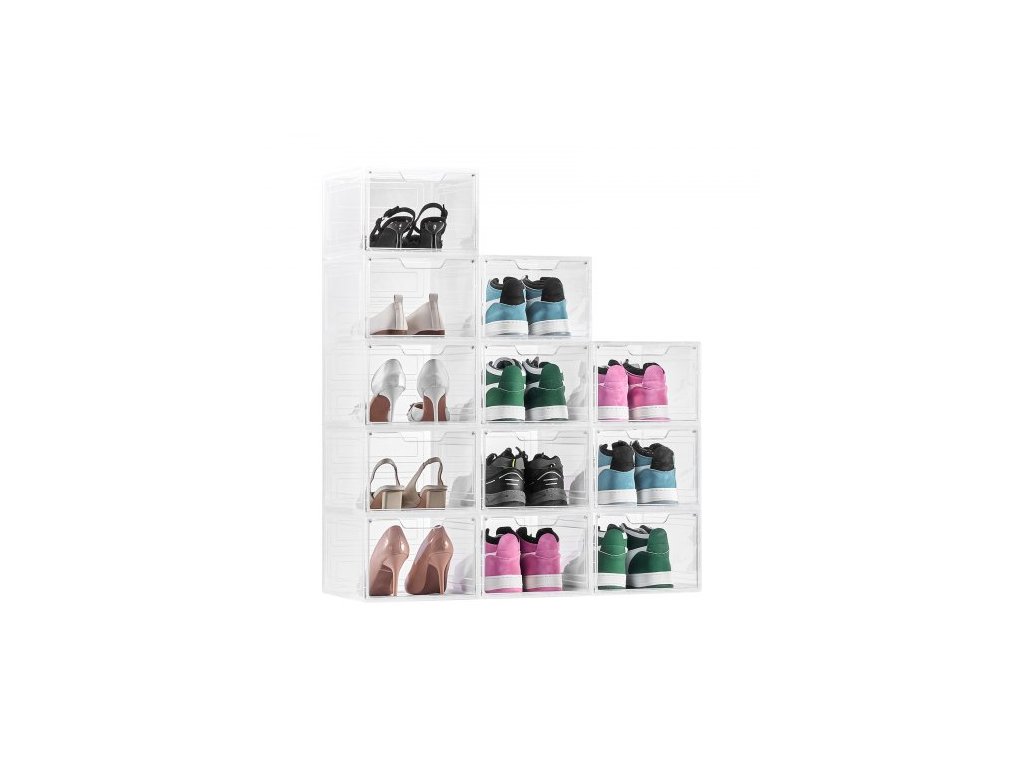 úložné boxy na boty, 12 kusů průhledných stohovatelných úložných boxů na boty s magnetickými dvířky, vhodné až do velikosti US 13, plastové boxy na tenisky, boty a klobouky, průhledně bíléModulární a všestranné