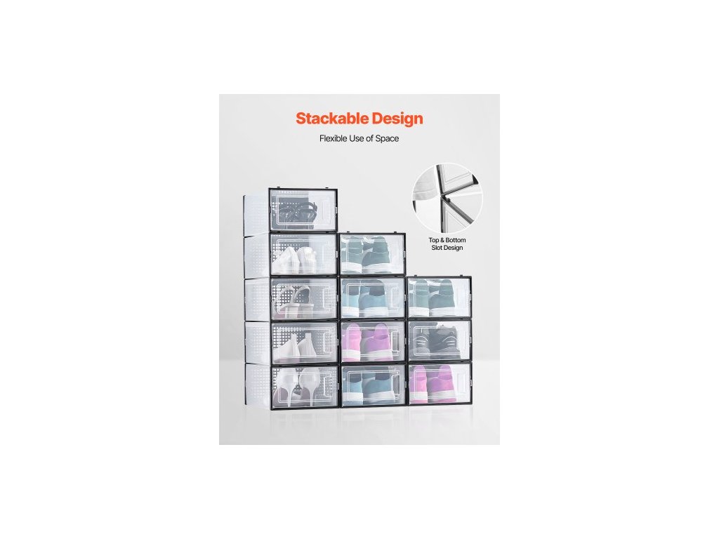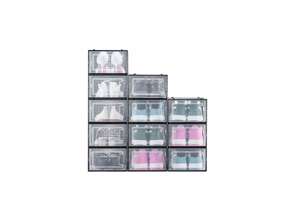 úložné boxy na boty, 12 kusů stohovatelných úložných organizérů na boty, vhodné až do velikosti US 11, plastové modulární úložné boxy na tenisky pro uložení vysokých podpatků, bot a klobouků, černý rám