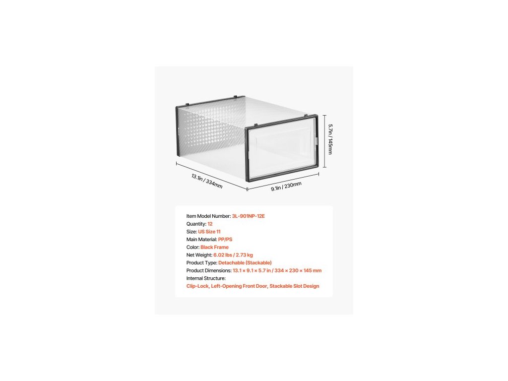Typ produktu: Odnímatelný (stohovatelný),Velikost: Velikost US 11,Barva: Černý rám,Číslo modelu položky: 3L-901NP-12E,Množství: 12,Rozměry produktu: 13,1 x 9,1 x 5,7 palce / 334 x 230 x 145 mm,Čistá hmotnost: 6,02 lbs / 2,73 kg,Hlavní materiál: PP/PS