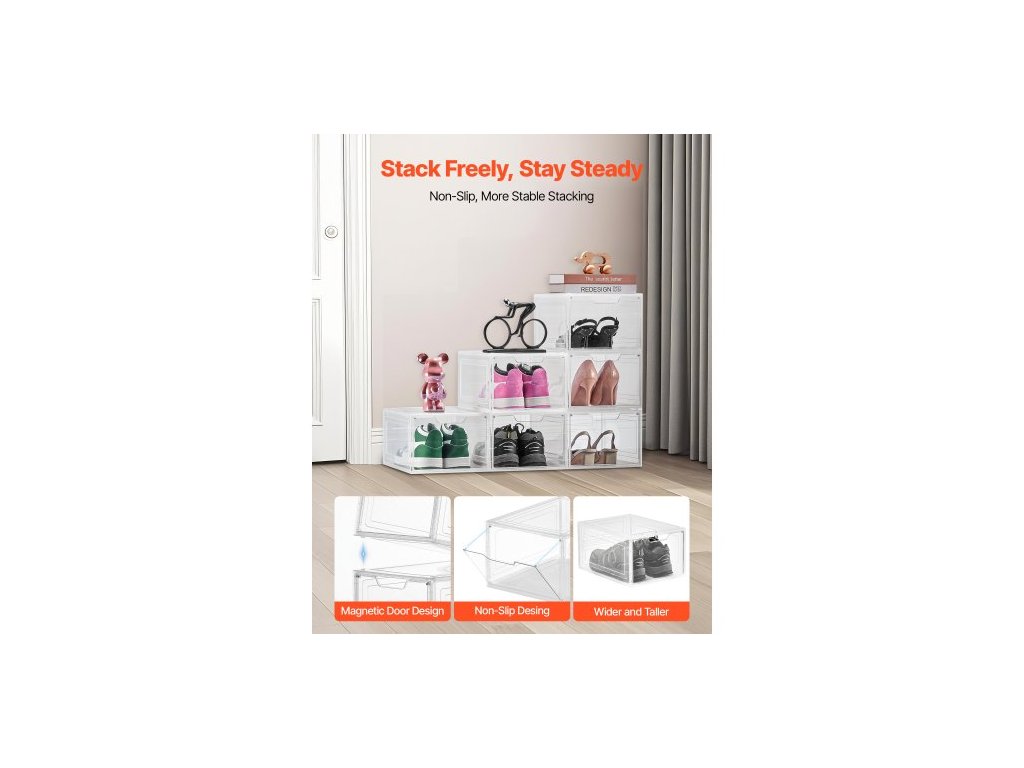 úložné boxy na boty, 6 kusů průhledných stohovatelných úložných boxů na boty s magnetickými dvířky, vhodné až do velikosti US 13, plastové boxy na tenisky, boty a klobouky, průhledně bíléModulární a všestranné