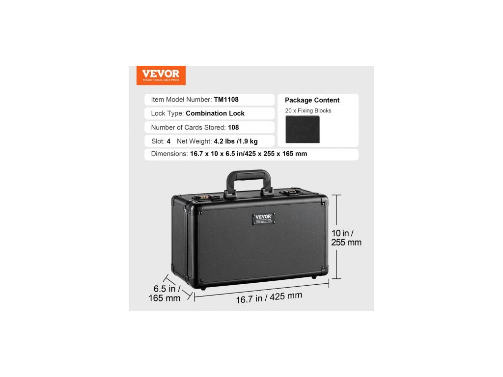 Typ zámku: Kombinační zámek,Počet uložených karet: 108,Číslo modelu položky: TM1108,Slot: 4,Rozměry: 16,7 x 10 x 6,5 palce/425 x 255 x 165 mm,Čistá hmotnost: 4,2 lbs /1,9 kg