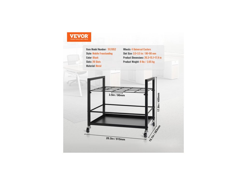 Počet slotů: 20 slotů, Kolečka: 4 univerzální kolečka, Barva: Černá, Číslo modelu položky: TFLT052, Hmotnost výrobku: 3,65 kg, Styl: Mobilní volně stojící, Materiál: Kov, Velikost slotu: 90 × 90 mm, Rozměry výrobku: 515 × 383 × 455 mm