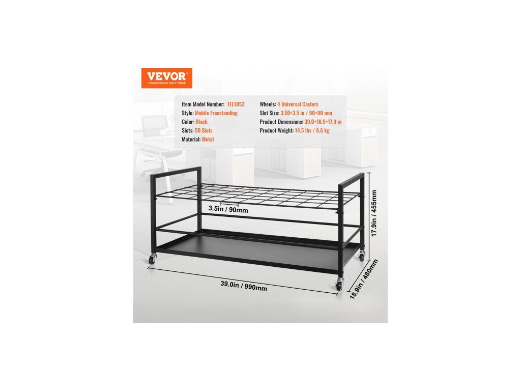 Počet míst: 50 míst, Kolečka: 4 univerzální kolečka, Barva: Černá, Číslo modelu položky: TFLT053, Hmotnost výrobku: 6,6 kg, Styl: Mobilní volně stojící, Materiál: Kov, Velikost otvoru: 90 × 90 mm, Rozměry výrobku: 990 × 480 × 455 mm