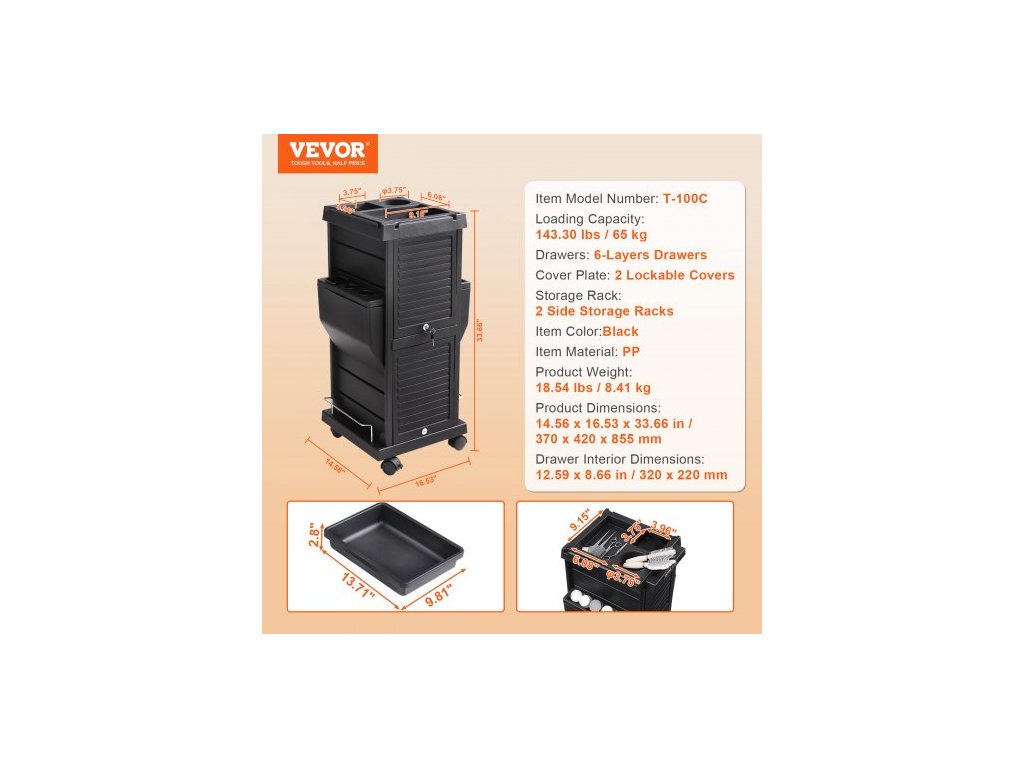 Materiál výrobku: PP,Barva výrobku: Černá,Vnitřní rozměry zásuvky: 12,59 x 8,66 palce / 320 x 220 mm,Číslo modelu výrobku: T-100C,Hmotnost výrobku: 18,54 lbs / 8,41 kg,Nosnost: 143 lbs / 65 kg,Zásuvky: 6vrstvé zásuvky,Rozměry výrobku: 14,56 x 16,53 x 33,66 palce / 370 x 420 x 855 mm, Krycí deska: 2 uzamykatelné kryty, Úložný regál: 2 boční úložné regály
