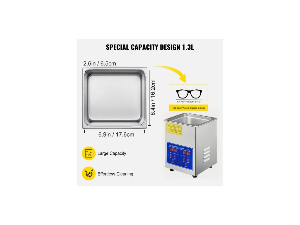 Zeiteintell (LED-Digitalanzeige),Produktové řady (D x Š x V): 7,1 x 6,5 x 8,3 Zoll / 18 x 16,5 x 21,2 cm,Ultrafrekvenční: 40 kHz,Anzahl der Wandler: 1 Satz,Ultraschallleung:304,Vysílač: 60:304. Wechselstrom 220 V / 50 Hz, Tankabmessungen (D x Š x V): 6,9 x 6,4 x 2,6 Zoll / 17,6 x 16,2 x 6,5 cm, Objem nádrže: 1–1,3 l (da der Boden des Ultraschallreinigers eine gekrümmte Oberfläche hat, is das das tatsächliche Volumen kleiner.)