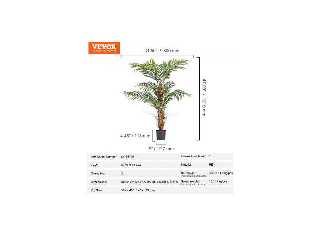 Typ: Betelová palma,Velikost květináče: Φ5" x 4,45" / 127 x 113 mm,Čistá hmotnost (včetně veškerého příslušenství): 1,8 kg/ks,Číslo modelu položky: LY-SS-001,Rozměry: 800 x 800 x 1219 mm,Množství: 2,Materiál: PE,Listy Množství: 10