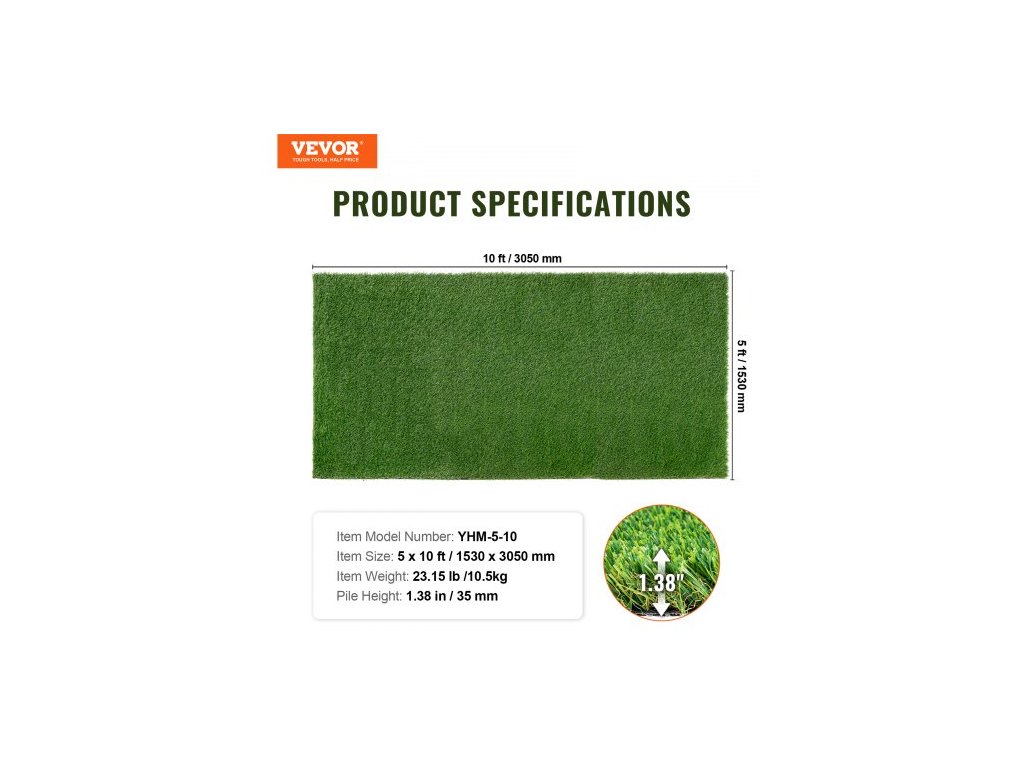 Výška vlasu: 1,38 palce / 35 mm,Rozměry položky: 5' x 10' / 1530 x 3050 mm,Barva svislých vláken: tmavě zelená + světle zelená,Počet stehů: 17000 (stehů/m²),Číslo modelu položky: YHM-5-10,Barva zakřivených vláken: světle zelená + světle béžová,Materiál: PP+PE