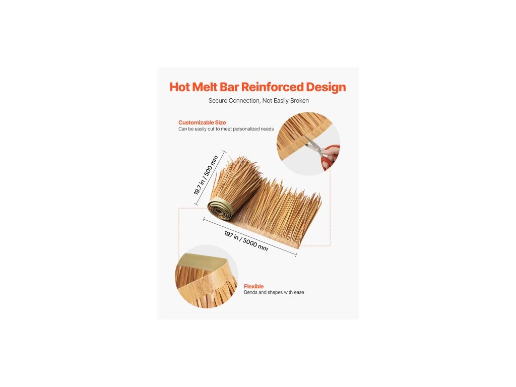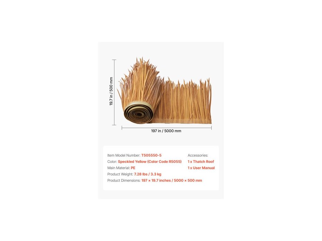 Umělá střešní krytina z doškové trávy, 0,5 x 5 m mexický styl, sukně pro barové chatky Tiki, vodotěsná a ohnivzdorná, tráva Palapa s motivem kachny pro terasu, bazén, pláž, havajskou párty, dekorace, odolná a odolná vůči povětrnostním vlivům, přizpůsobitelná a snadno se řezá, jednoduchá instalace, všestranné použití, různé velikosti, barva: tečkovaná žlutá (kód barvy R5055), číslo modelu položky: T505550-5, hmotnost výrobku: 7,28 lbs / 3,3 kg, rozměry: 1,6 × 16,4 ft / 0,5M × 5M, rozměry výrobku: 197 × 19,7 palců / 5000 × 500 mm, hlavní materiál: PEDoplňkové parametry