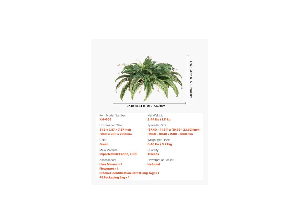Rozměry v rozloženém stavu: 800 x 200 x 200 mm,Rozměry v rozloženém stavu: (950 - 1050) x (500 - 600) mm,Květináč nebo košík: Součástí balení,Barva: Zelená,Číslo modelu položky: XH-G05,Množství: 1 kus,Čistá hmotnost: 2,44 lbs / 1,11 kg, Hlavní materiál: Dovážená hedvábná tkanina, LDPE, Hmotnost na rostlinu: 1,2 lbs / 0,54 kg