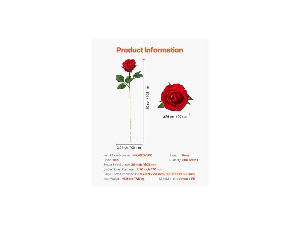 Rozměry jednoho stonku: 3,9 x 3,9 x 20,1 palce / 100 x 100 x 510 mm,Typ: Růže,Průměr jednoho květu: 2,76 palce / 70 mm,Barva: Červená,Číslo modelu položky: JNR-RED-500,Množství: 500 stonků,Délka jednoho stonku: 20 palců / 508 mm,Hmotnost položky: 16,5 lbs / 7,5 kg,Hlavní materiál: Samet + PE