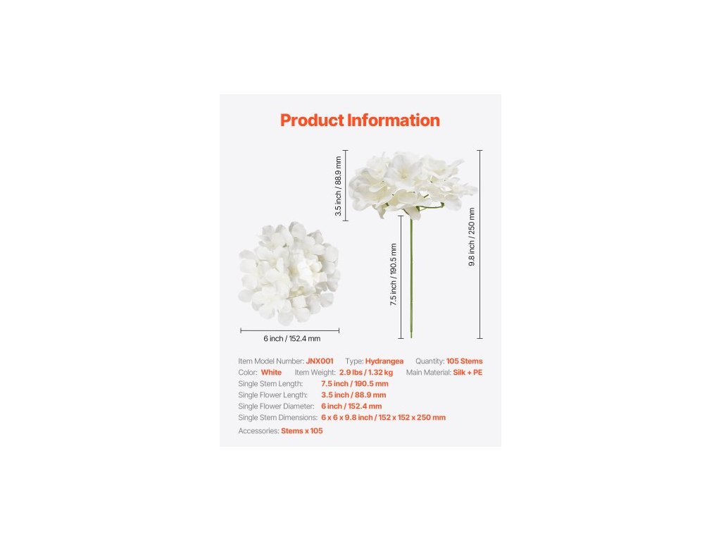 Rozměry jednoho stonku: 6 x 6 x 9,8 palce / 152 x 152 x 250 mm,Typ: Hortenzie,Průměr jednoho květu: 6 palců / 152,4 mm,Barva: Bílá,Číslo modelu položky: JNX001,Množství: 105 stonků,Délka jednoho stonku: 7,5 palce / 190,5 mm,Materiál: Hedvábí + PE,Délka jednoho květu: 3,5 palce / 88,9 mm,Položka Hmotnost: 1,32 kg