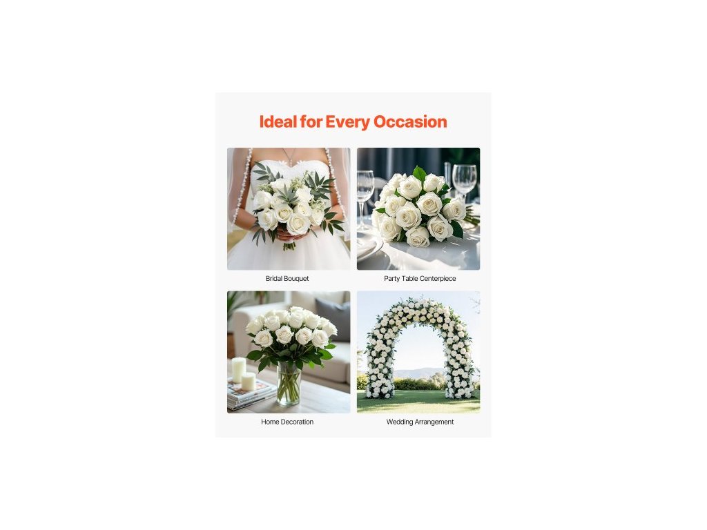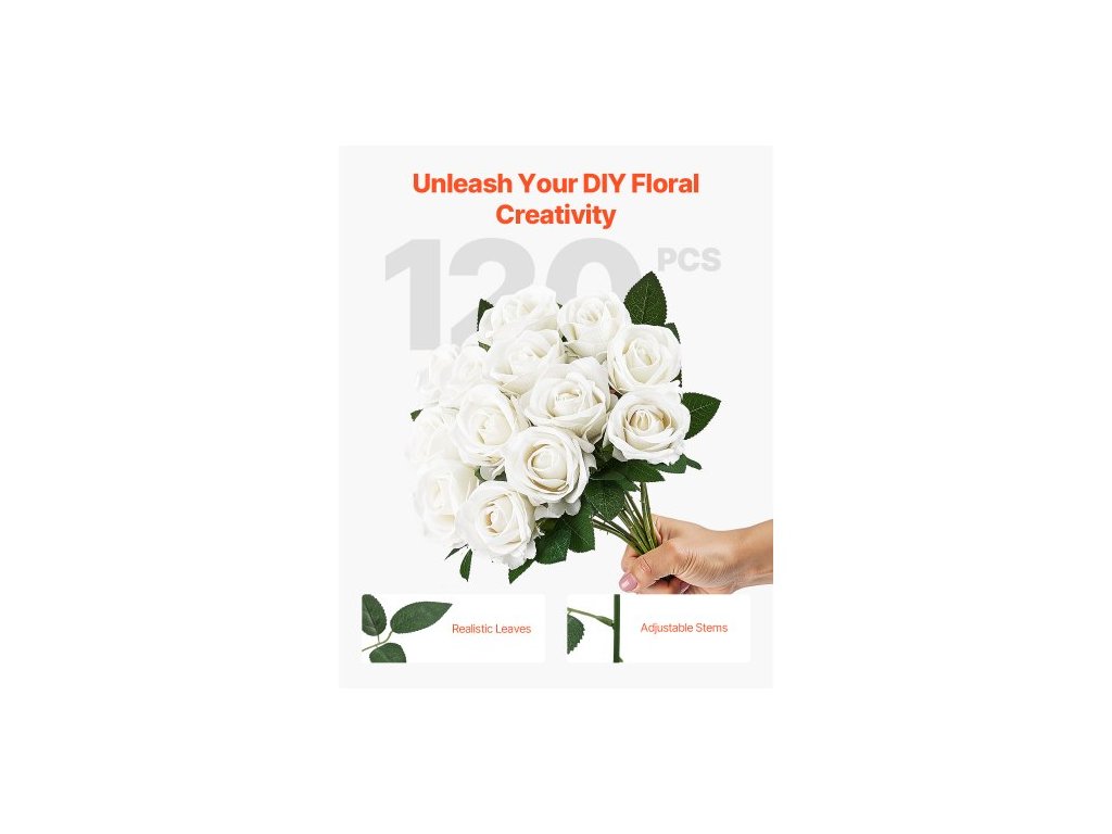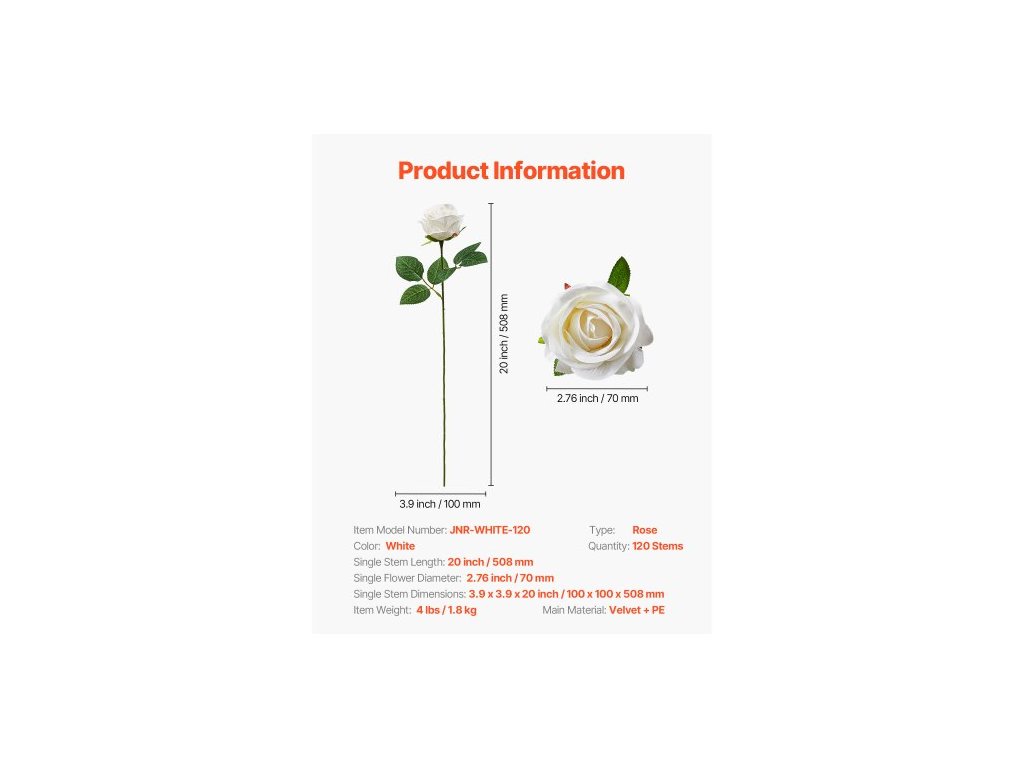 Rozměry jednoho stonku: 3,9 x 3,9 x 20,1 palce / 100 x 100 x 510 mm,Typ: Růže,Průměr jednoho květu: 2,76 palce / 70 mm,Barva: Bílá,Číslo modelu položky: JNR-WHITE-120,Množství: 120 stonků,Délka jednoho stonku: 20 palců / 508 mm,Hmotnost položky: 4 lbs / 1,8 kg,Hlavní materiál: Samet + PE