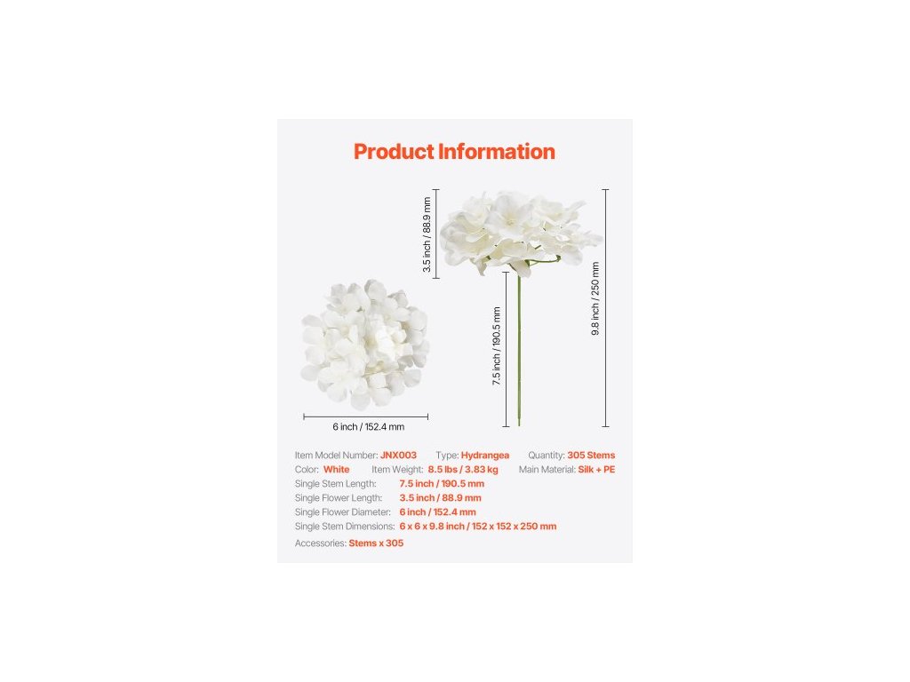 Rozměry jednoho stonku: 6 x 6 x 9,8 palce / 152 x 152 x 250 mm,Typ: Hortenzie,Průměr jednoho květu: 6 palců / 152,4 mm,Barva: Bílá,Číslo modelu položky: JNX003,Množství: 305 stonků,Délka jednoho stonku: 7,5 palce / 190,5 mm,Materiál: Hedvábí + PE,Délka jednoho květu: 3,5 palce / 88,9 mm,Položka Hmotnost: 8,5 liber / 3,83 kg
