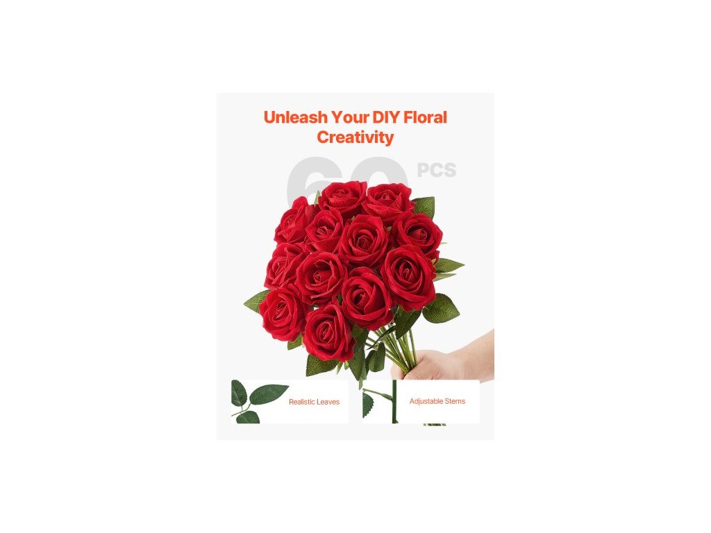 Rozměry jednoho stonku: 3,9 x 3,9 x 20,1 palce / 100 x 100 x 510 mm,Typ: Růže,Průměr jednoho květu: 2,76 palce / 70 mm,Barva: Červená,Číslo modelu položky: JNR-RED-060,Množství: 60 stonků,Délka jednoho stonku: 20 palců / 508 mm,Hmotnost položky: 2,2 lbs / 1 kg,Hlavní materiál: Samet + PE