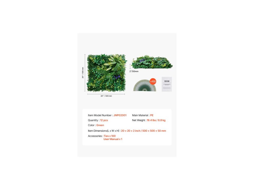 Umělé travnaté stěnové panely, 12 ks 20 x 20 palců, 3D kombinovaný zeleň z buxusu pro vnitřní i venkovní zelenou dekoraci a zakrytí plotu z břečťanu, soukromí na pozadí, nástěnný živý plot do zahradyŘezné