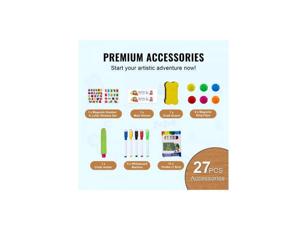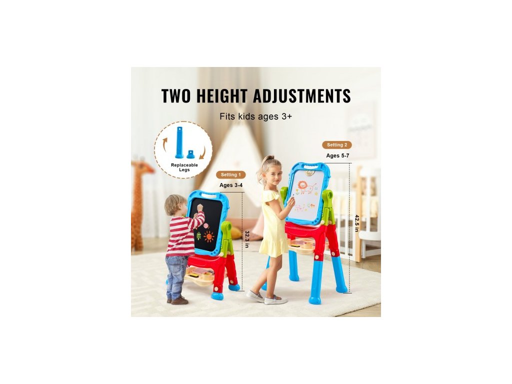 Umělecký stojan pro děti, 2v1 oboustranný dětský umělecký stojan s magnetickou bílou a křídovou tabulí, nastavitelná otočná a odnímatelná rýsovací deska s malířskými doplňky pro chlapce a dívkyOboustranný dětský umělecký stojan