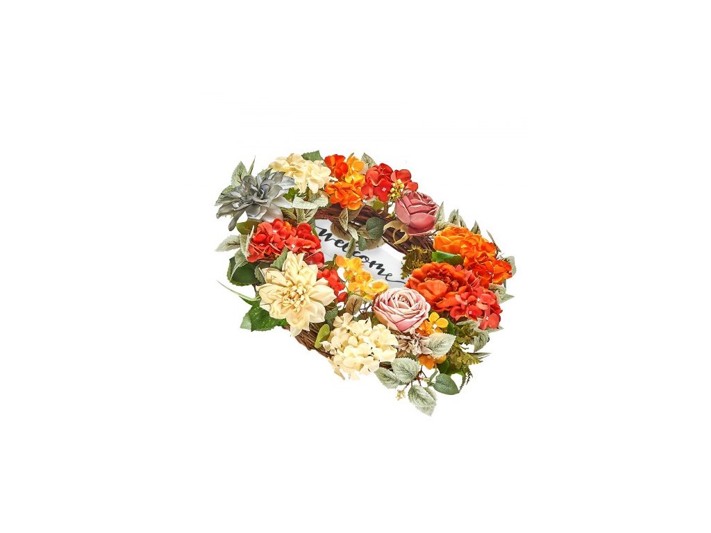 Umělý dekorativní věnec, 24 palců, červená oranžová žlutá, zdobený hortenziemi, růžemi, dřevěná cedule, celoroční věnec pro všechna roční období, vnitřní i venkovní dekorace na stěnu, okno, festival