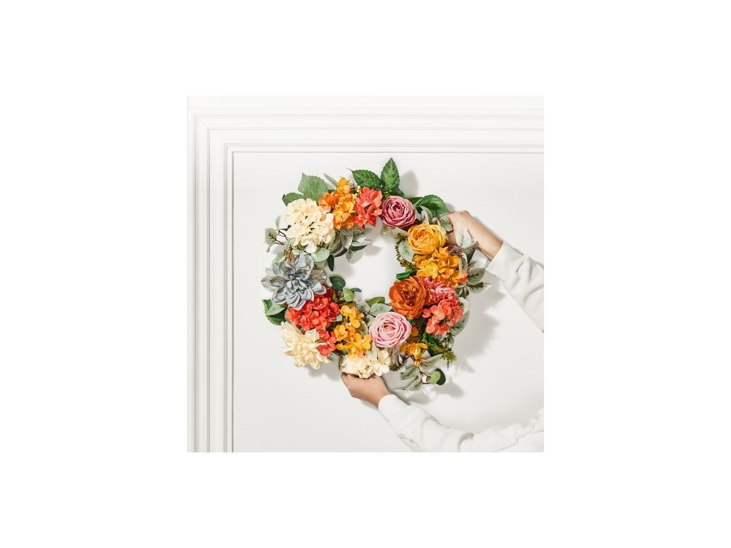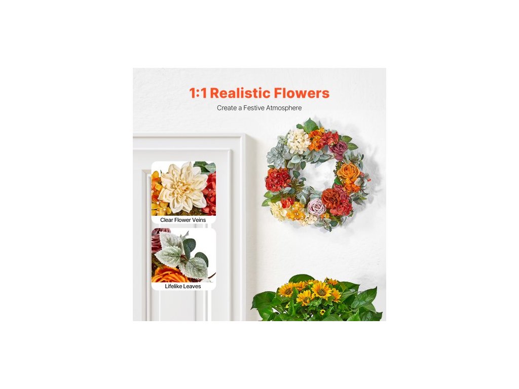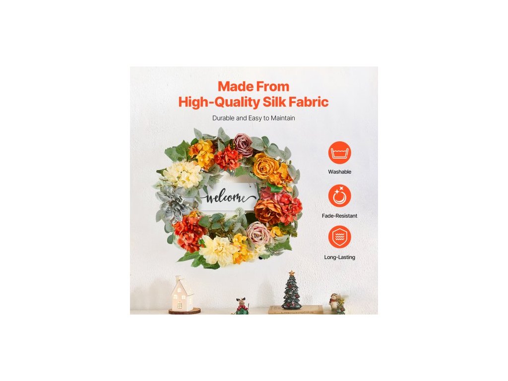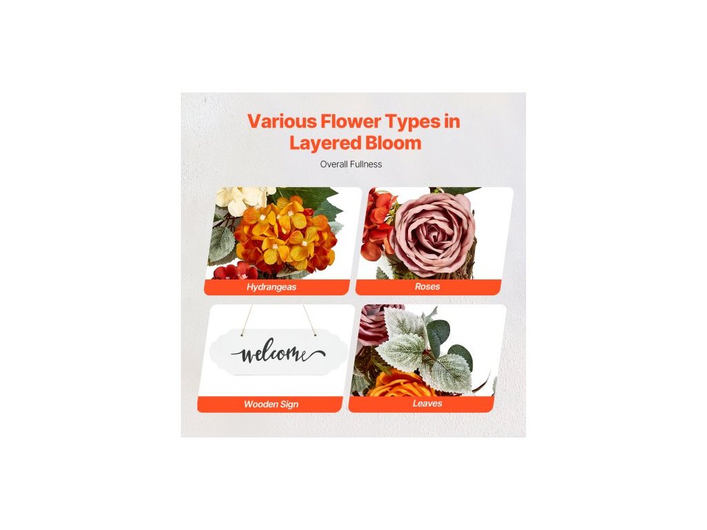 Umělý dekorativní věnec, 24 palců, červená, oranžová, žlutá, zdobený hortenziemi, růžemi, dřevěná cedule, celoroční věnec pro všechna roční období, vnitřní i venkovní dekorace na stěnu, okno, festivalové dekoraceRealistické květiny replikované v 1:1