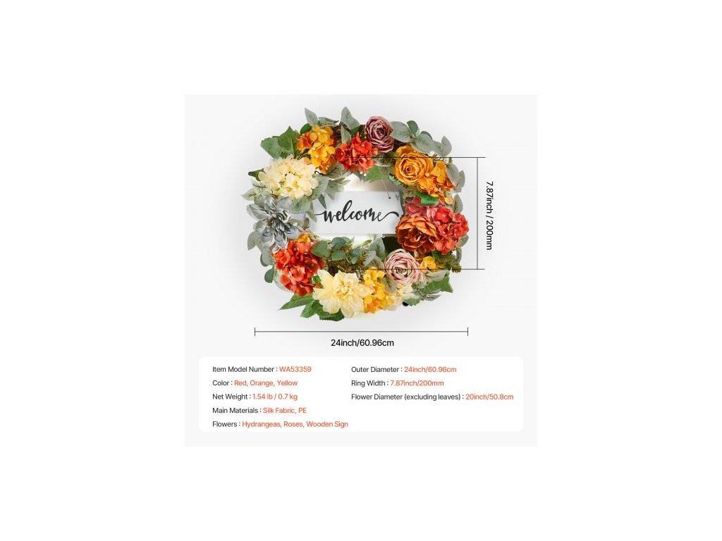 Vnější průměr: 24 palců/60,96 cm,Hlavní materiály: hedvábná tkanina, PE,Průměr květu (bez listů): 20 palců/50,8 cm,Šířka prstence: 7,87 palců/200 mm,Barva: červená, oranžová, žlutá,Číslo modelu položky: WA53359,Květiny: Hortenzie, růže, dřevěná cedule,Čistá hmotnost: 1,54 lb/0,7 kg