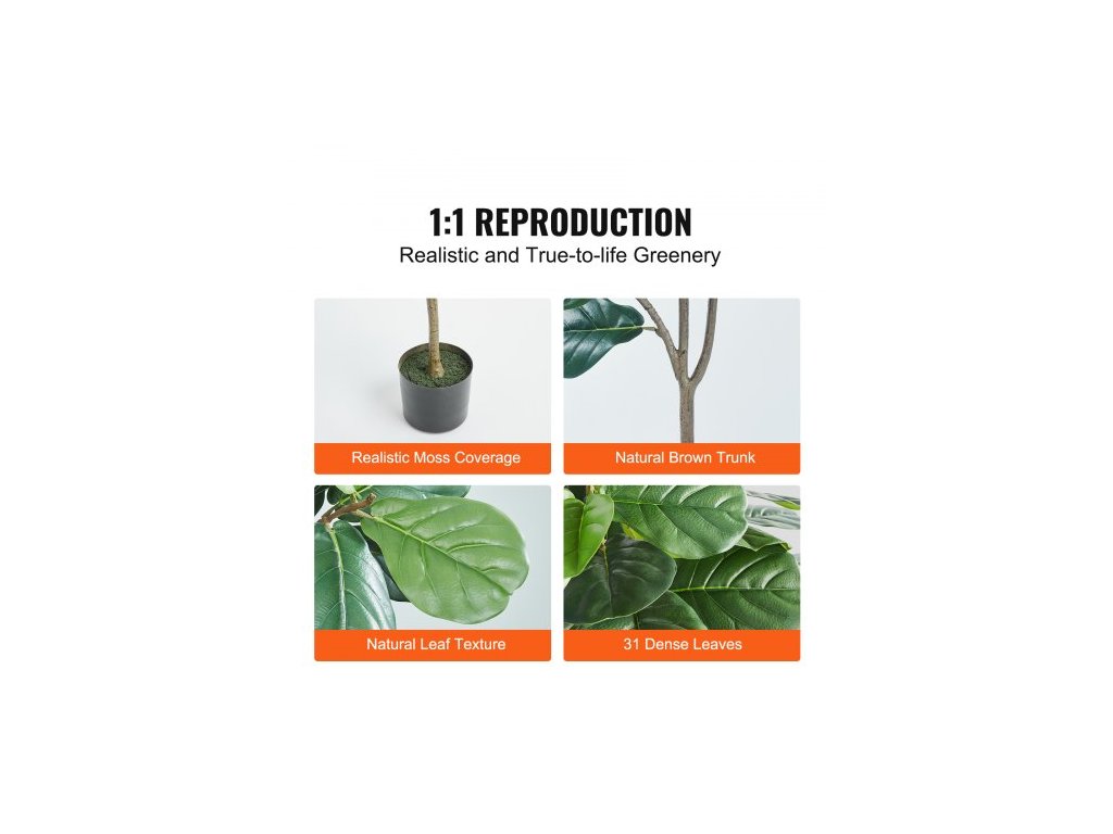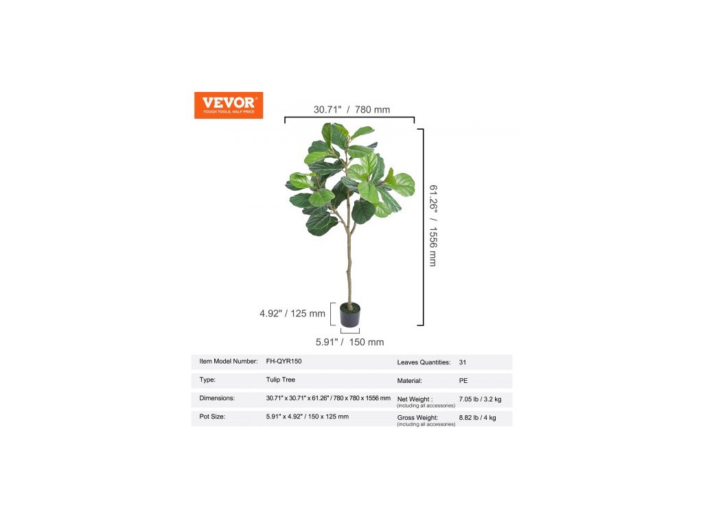 Typ: Fíkovník s houslovými listy,Velikost květináče: Φ5,91" x 4,92" / Φ150 x 125 mm,Čistá hmotnost (včetně veškerého příslušenství): 7,05 lb / 3,2 kg,Číslo modelu položky: FH-QYR150,Rozměry: 30,71" x 30,71" x 61,26" / 780 x 780 x 1556 mm,Materiál: PE,Listy Množství: 31