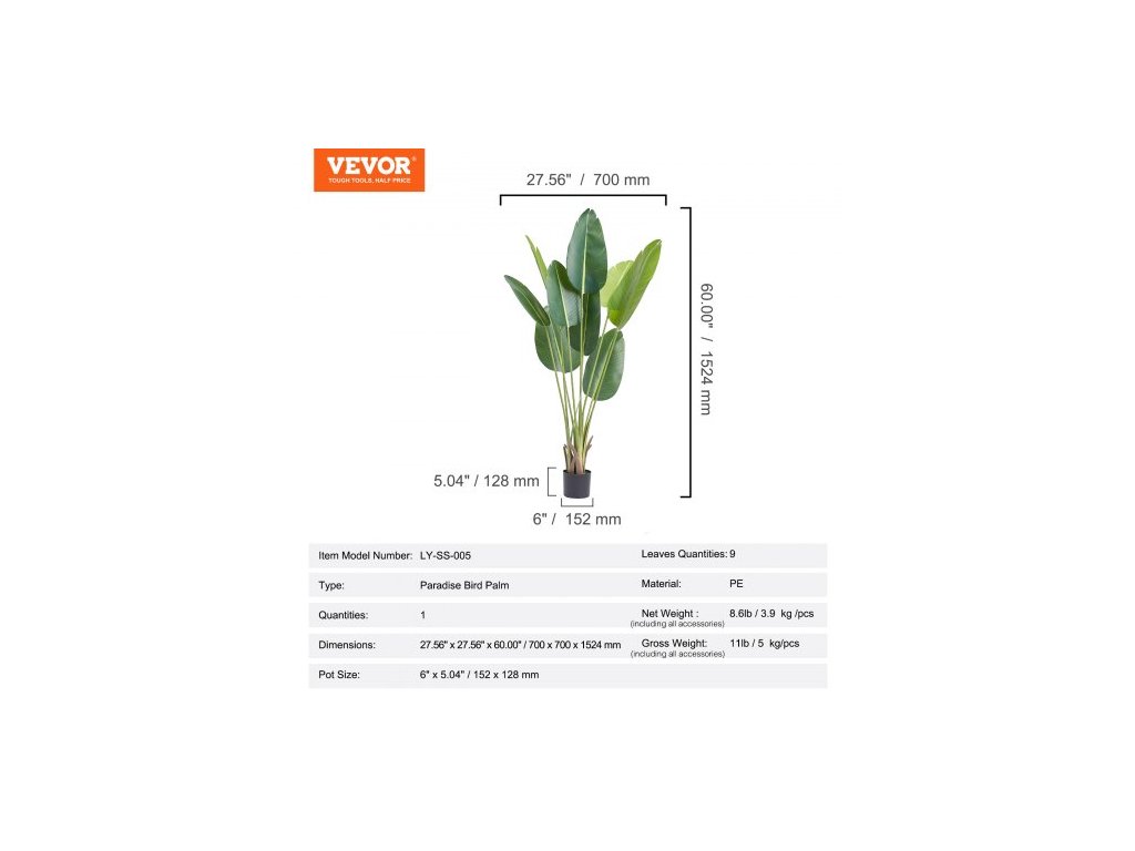 Typ: Palma Rajky,Velikost květináče: Φ6" x 5,04" / 152 x 128 mm,Model položky Číslo modelu položky: LY-SS-005,Čistá hmotnost (včetně veškerého příslušenství): 8,6 lb / 3,9 kg,Rozměry: 27,56" x 27,56" x 60,00" / 700 x 700 x 1524 mm,Množství: 1,Materiál: PE