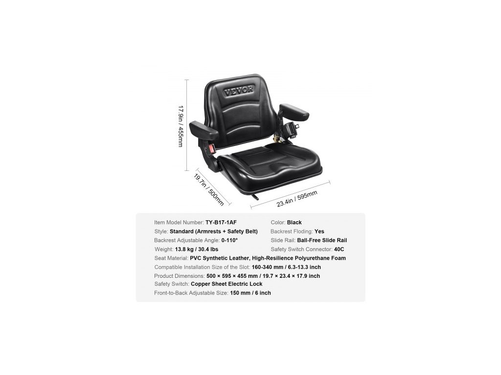 Barva: Černá, Konektor bezpečnostního spínače: 40C, Rozměry výrobku: 595 × 520 × 455 mm/23,4 × 20,5 × 17,9 palce, Hmotnost: 13,8 kg/30,4 lbs, Sklopné opěradlo: Ano, Kompatibilní velikost drážky pro instalaci: 160-340 mm/6,3-13,3 palce, Nastavitelná velikost zepředu dozadu: 150 mm/6 palců, Nastavitelný úhel opěradla: 0-110°, Číslo modelu položky: TY-B17-1AF,Provedení: Standardní (s loketními opěrkami a bezpečnostním pásem),Posuvná lišta: Bezkuličková posuvná lišta,Materiál sedáku: PVC syntetická kůže, vysoce odolná polyuretanová pěna,Bezpečnostní spínač: Měděný plech,Elektrický zámek