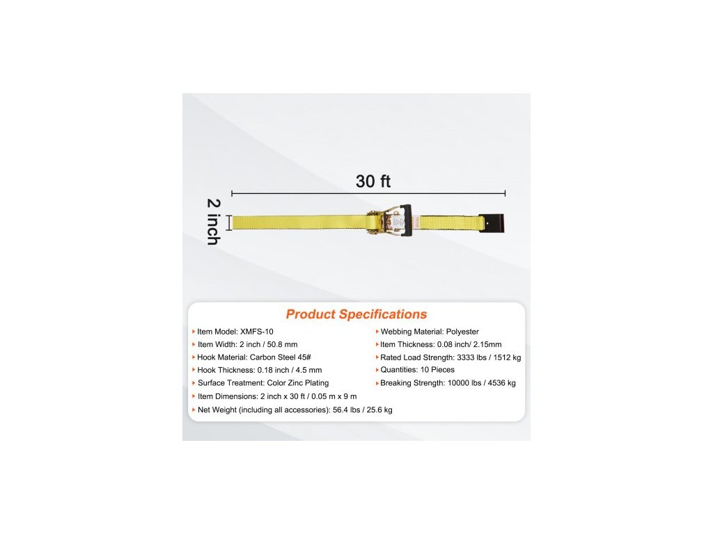 Jmenovitá nosnost: 1512 kg,Model výrobku: XMFS-10,Tloušťka výrobku: 2,15 mm,Materiál háku: Uhlíková ocel 45#,Čistá hmotnost (včetně veškerého příslušenství): 25,6 kg,Tloušťka háku: 4,5 mm,Měrná pevnost: 4536 kg,Povrchová úprava: Barevný zink,Rozměry výrobku: 5 cm x 9 m / 0,05 m x 9 m, Množství: 10 kusů, Šířka položky: 2 palce / 50,8 mm, Materiál popruhu: Polyester